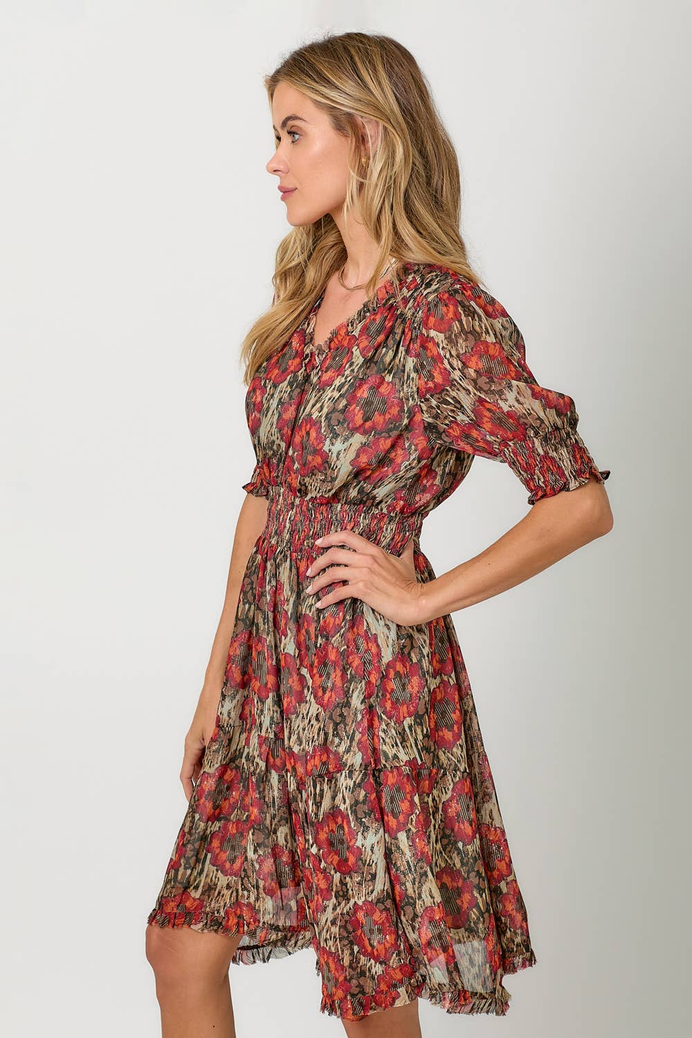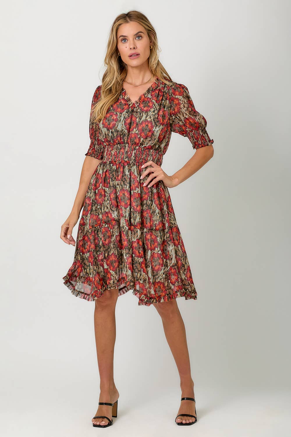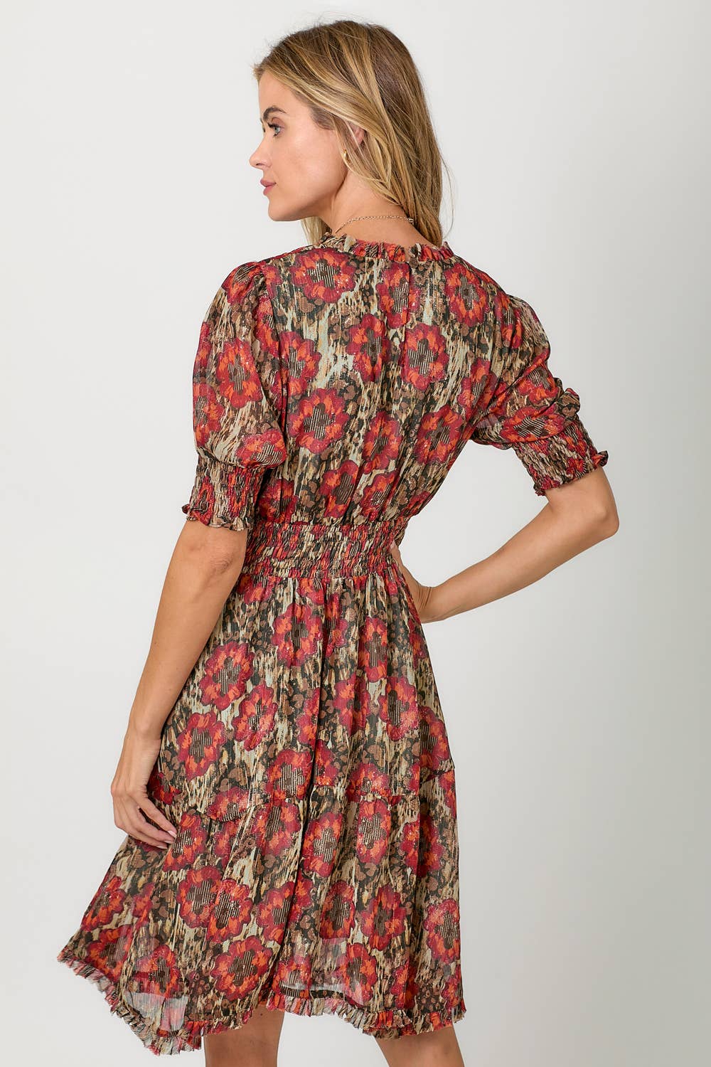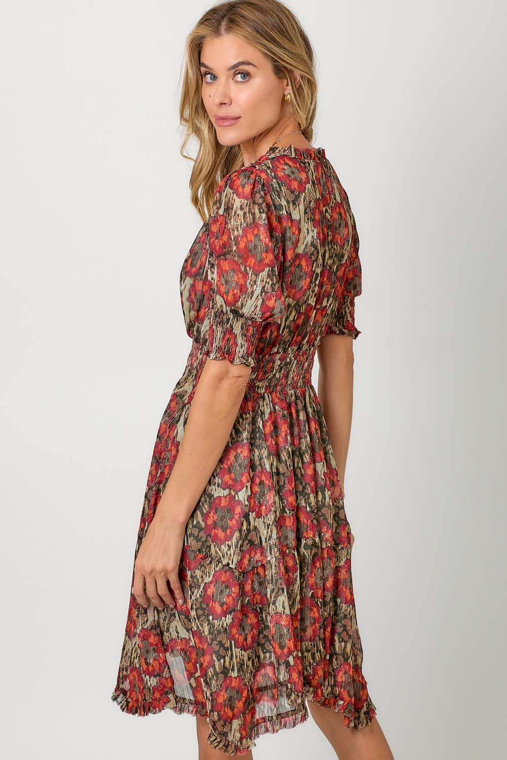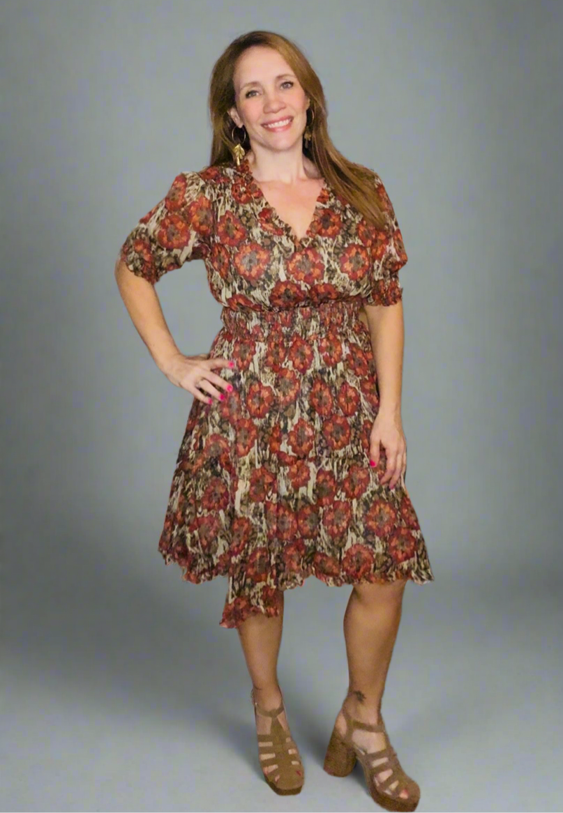 Step into shimmer and charm with this beautifully detailed floral dress by Mystree. Featuring a rich red and sage palette with gold lurex threading woven throughout, this dress is all about movement, femininity, and sparkle. The cinched waist flatters your figure while the soft bubble half sleeves and ruffled shark bite hem add a playful, flowy finish. A buttoned keyhole back adds a sweet, subtle detail to complete the look.