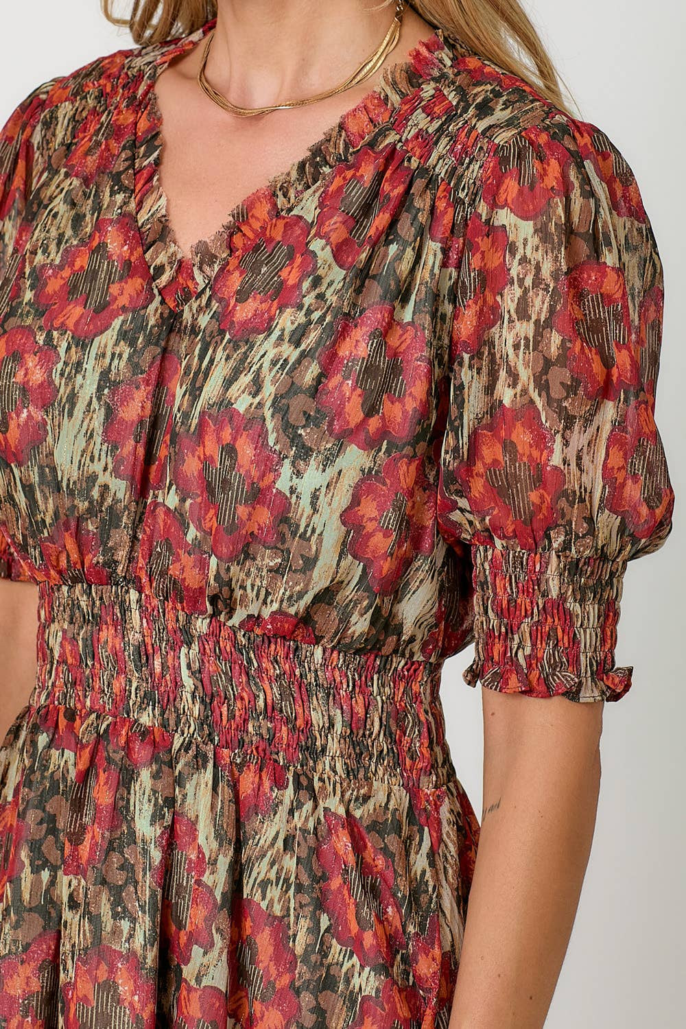 • Red and sage floral print with subtle gold sparkle throughout