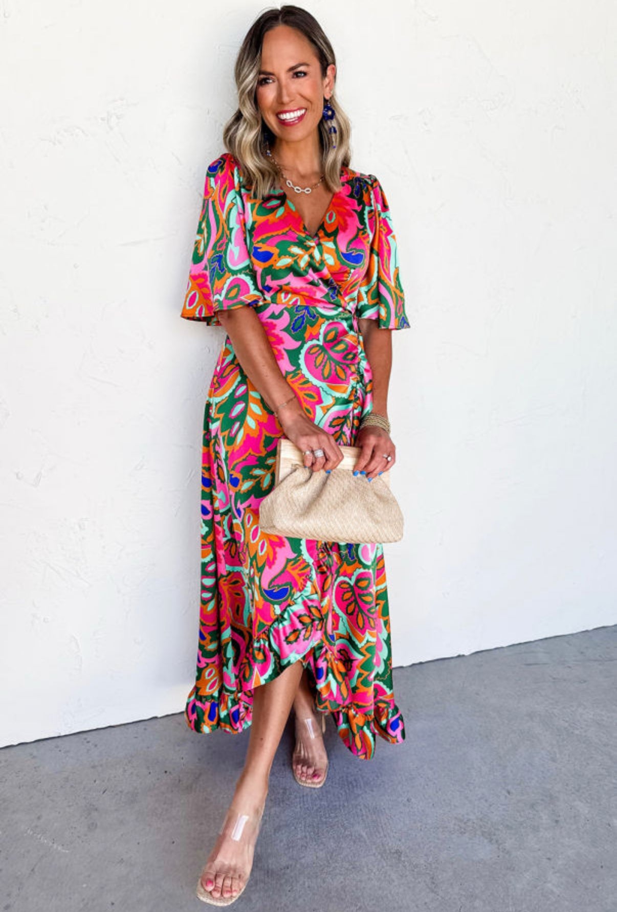 Rose Summer Plant Print Surpliced V-Neck Ruffled Asymmetric Slit Short Sleeve Maxi Dress
