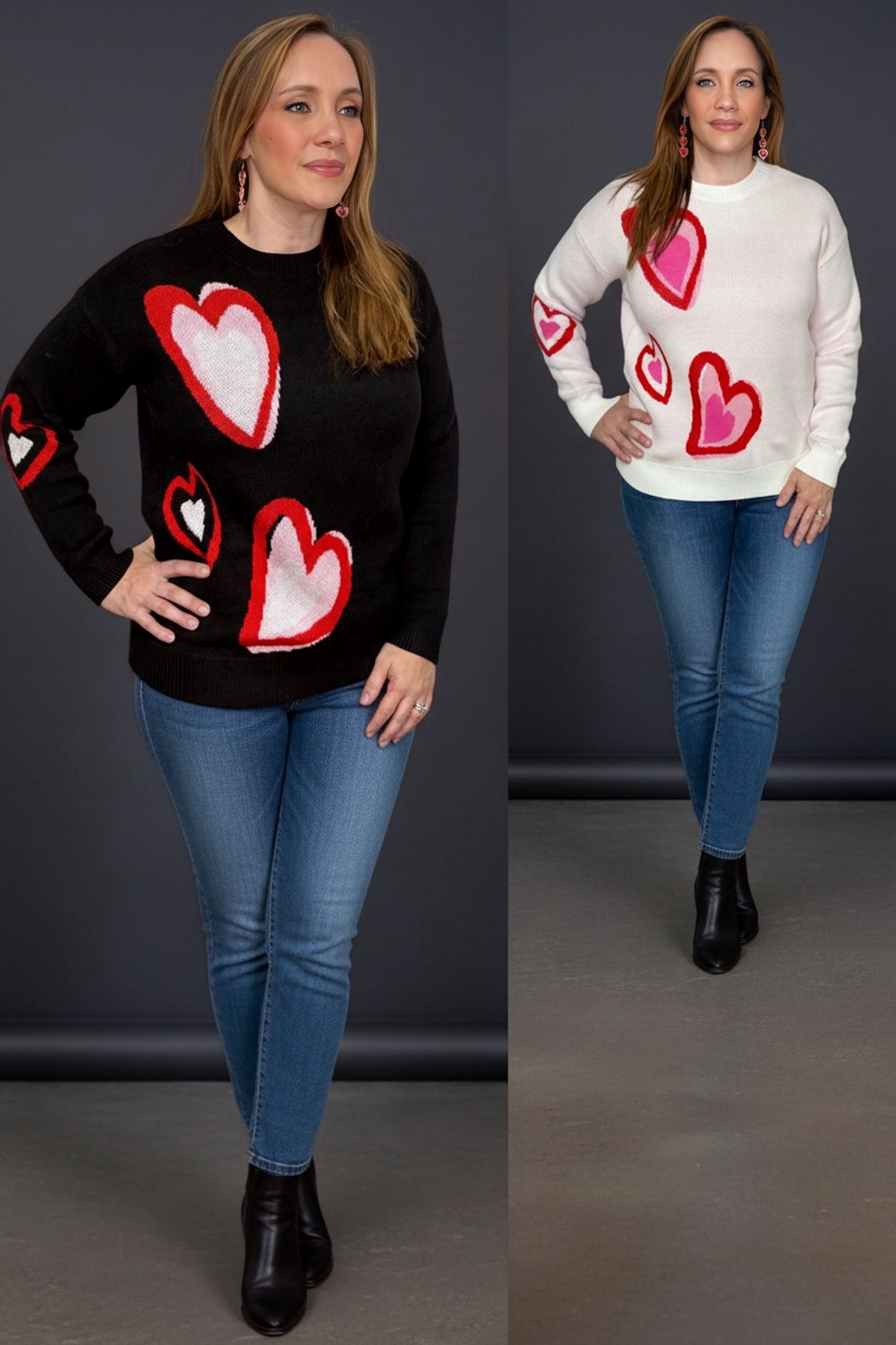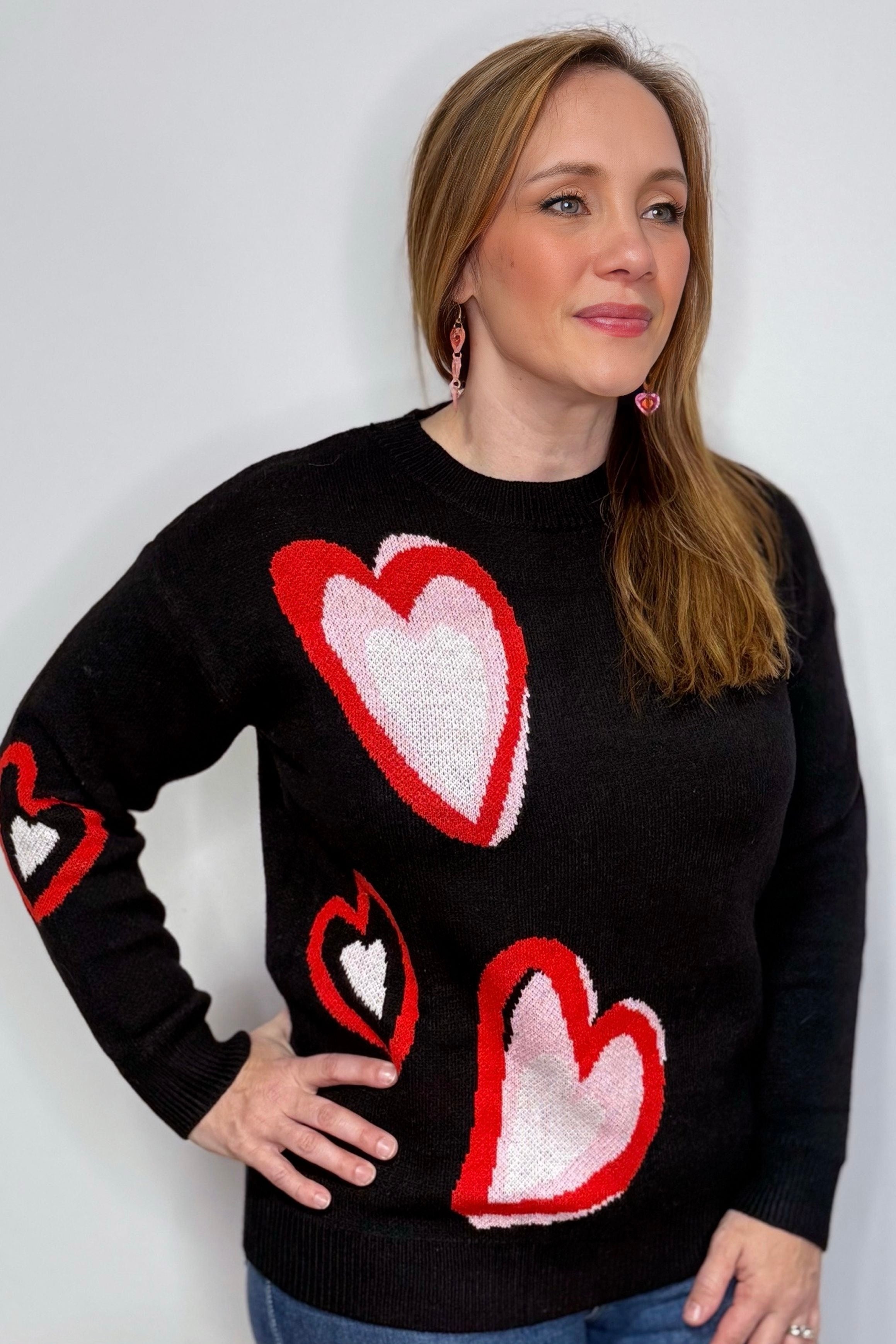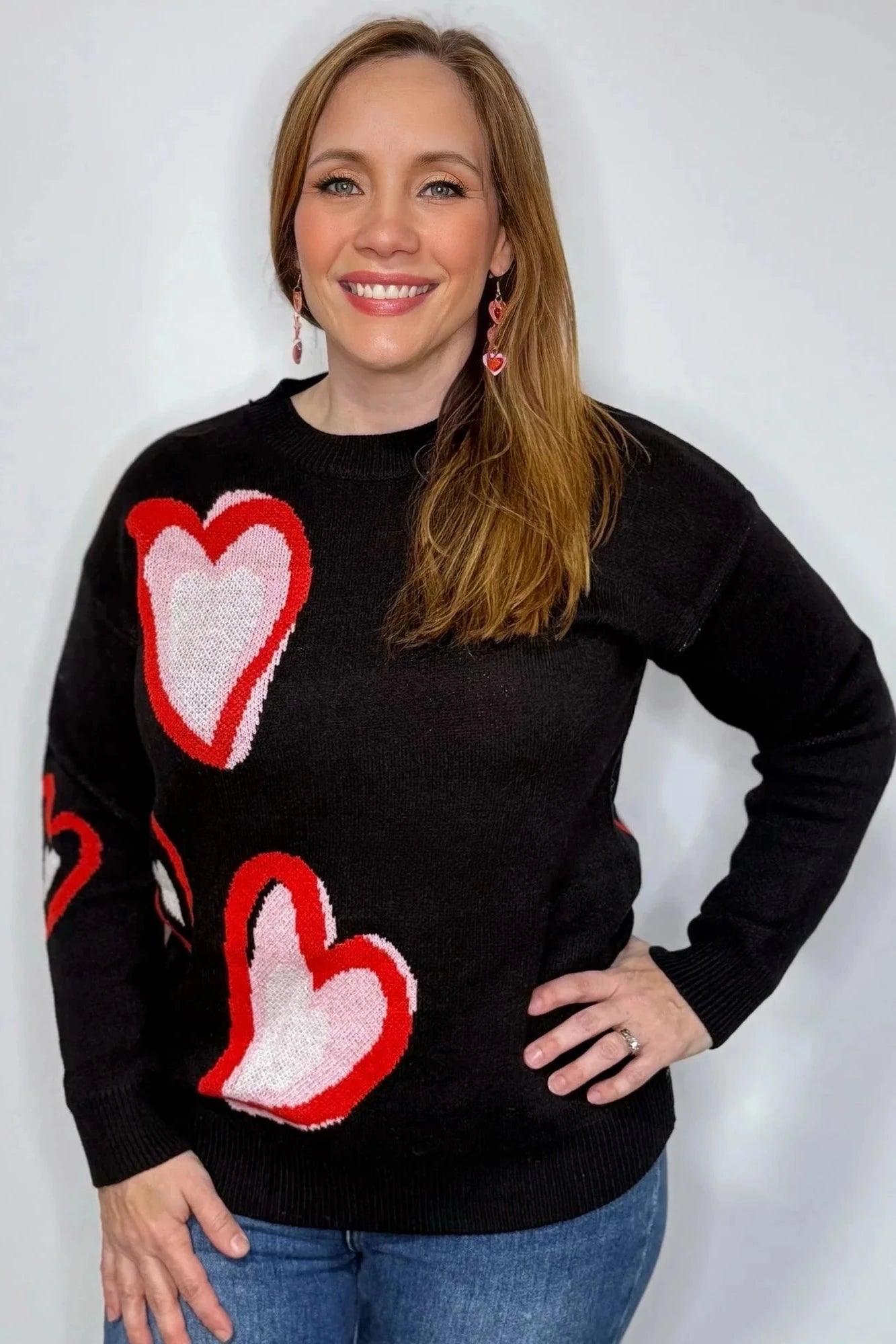 Fall head over heels for the Heartbreaker Valentine Sweater, the ultimate cozy-cute statement for Valentine’s Day and beyond. This eye-catching black knit sweater features bold layered heart graphics in red, blush, and white for a playful yet polished look that instantly steals hearts.
