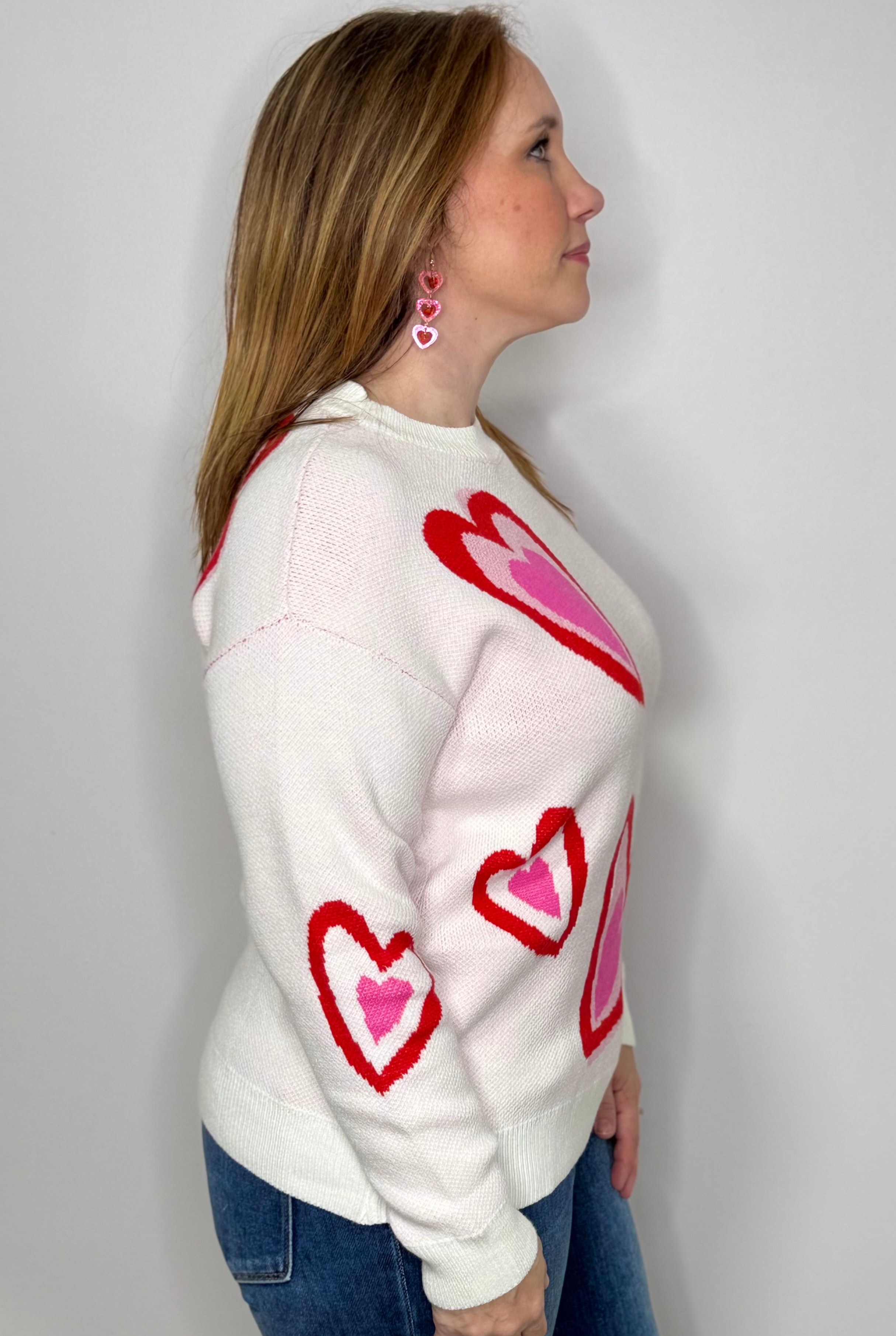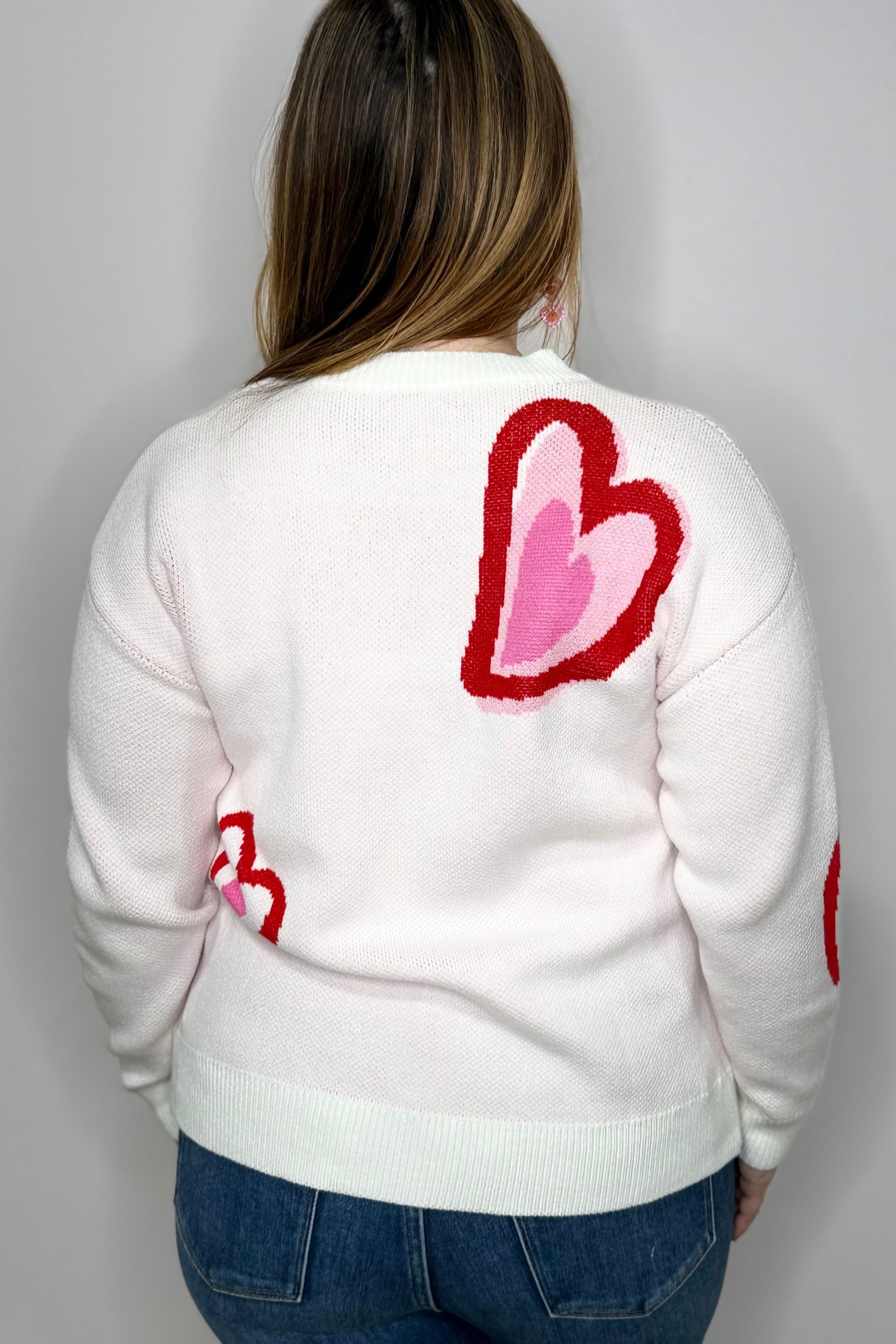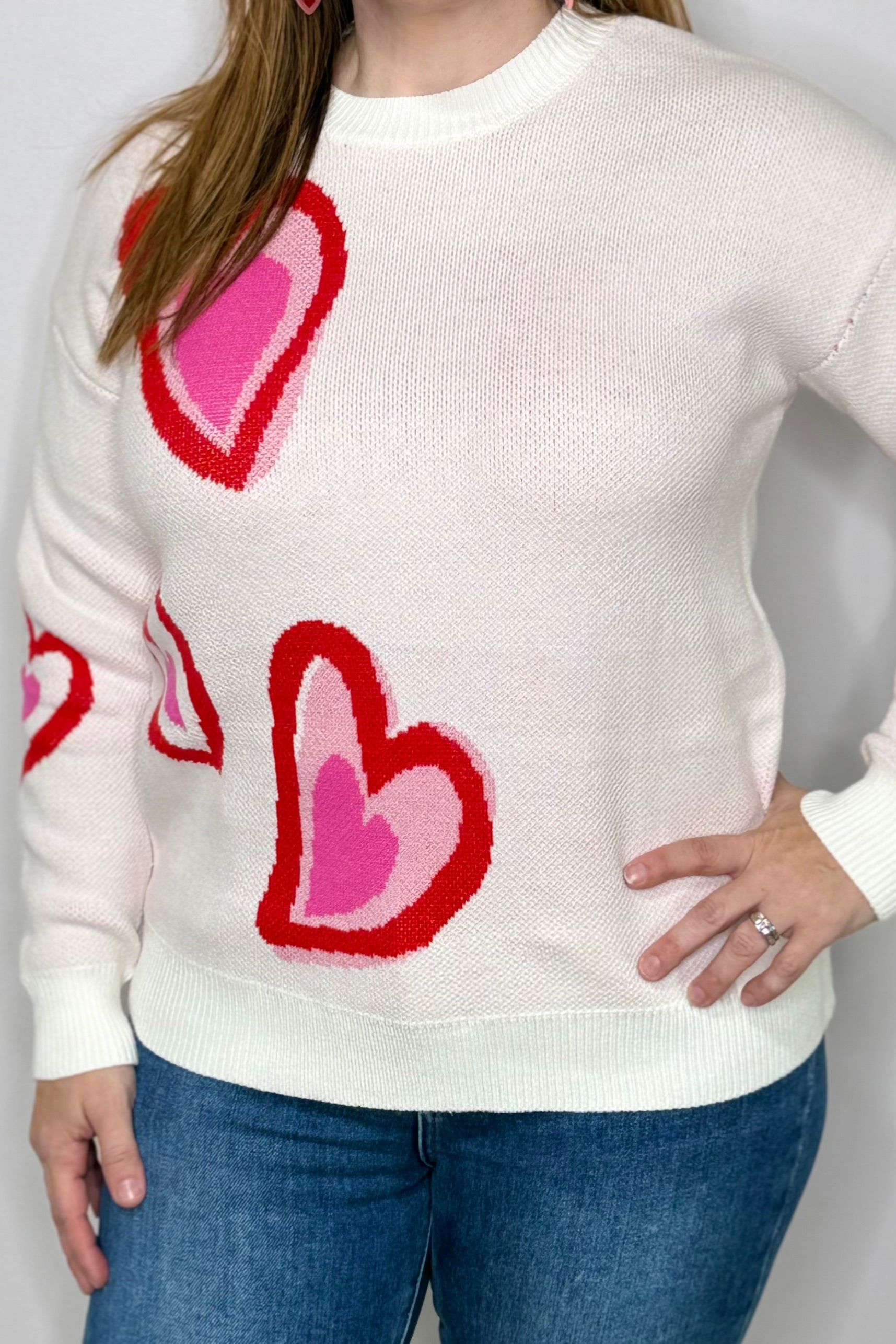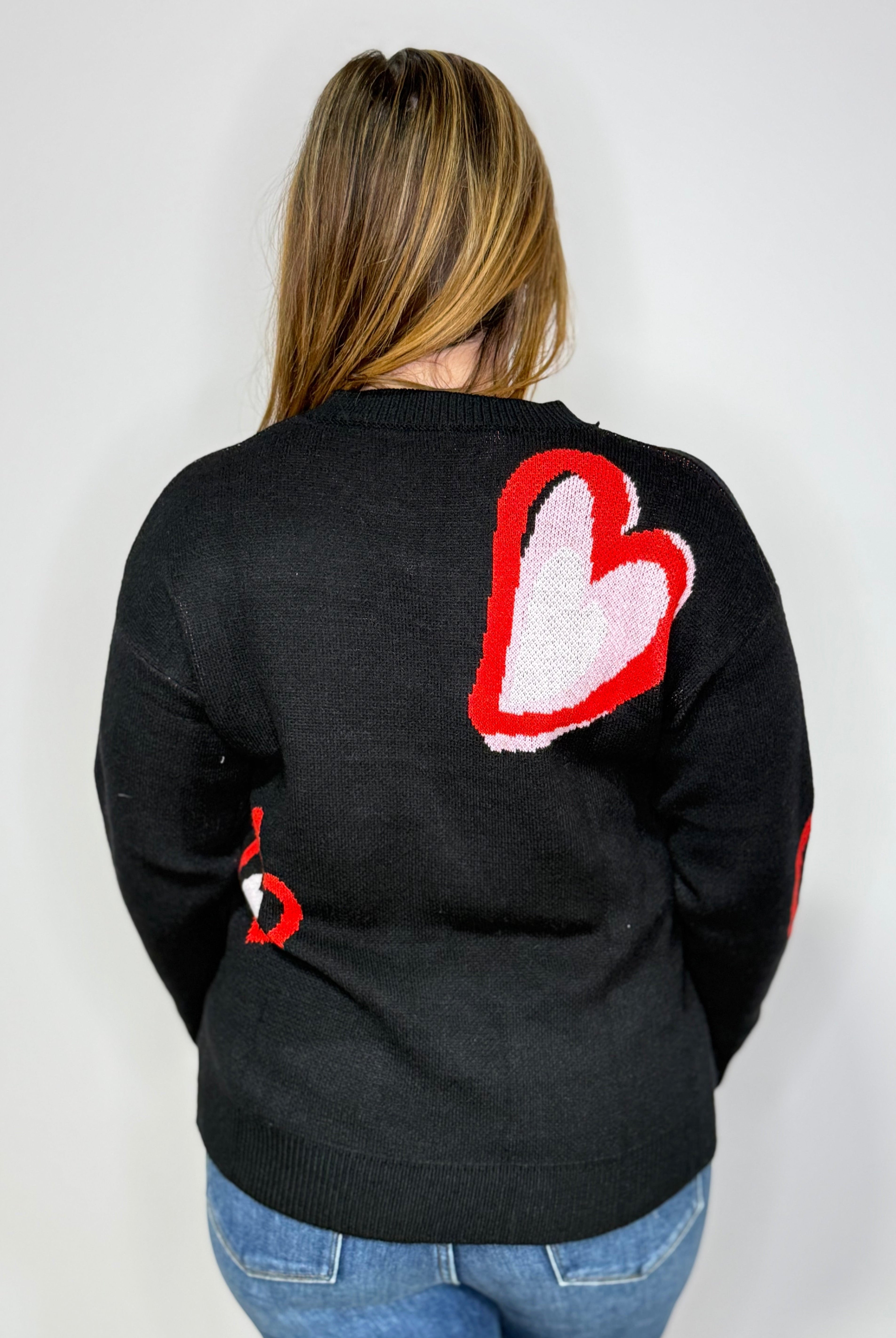 Fall head over heels for the Heartbreaker Valentine Sweater, the ultimate cozy-cute statement for Valentine’s Day and beyond. This eye-catching black knit sweater features bold layered heart graphics in red, blush, and white for a playful yet polished look that instantly steals hearts.