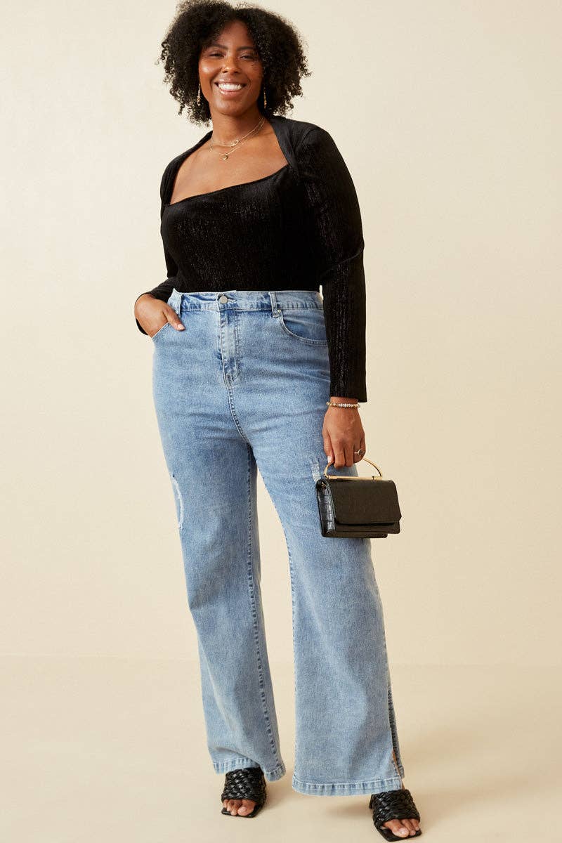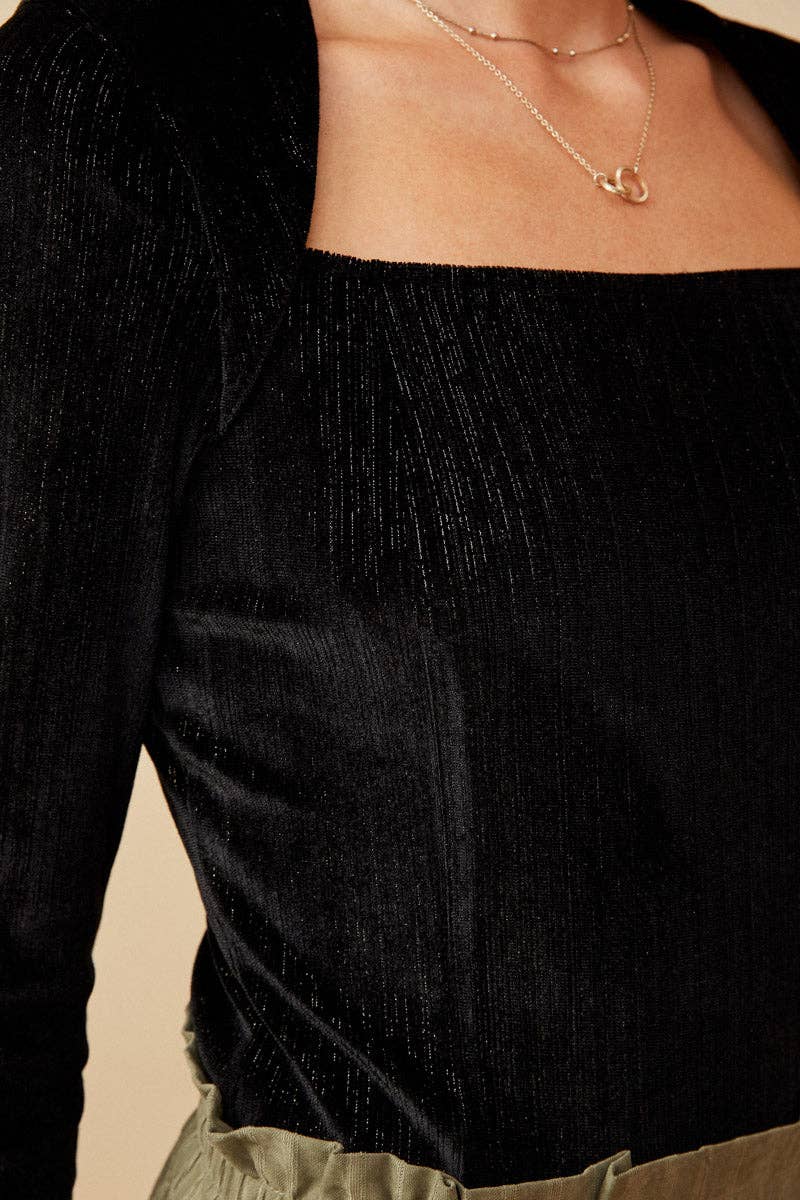 Lurex Square Neck Long Sleeve Bodysuit Features: * Velvet Knit Fabric * Square Cut Neckline * Long Sleeve Measurements: Size Length Chest Small 29" 14.63" Medium 29.63" 15.63" Large 30.25" 16.63" 1XL 32.25" 20.63" 2XL 33.13" 22.63" 3XL 34" 24.63" The measurements in the chart above reflect the garment laying flat. For body measurements please visit our Size Guide. Model Stats: * Height: 5'9.5" * Bust: 33" * Waist: 25" * Hip: 35" * Wearing Size: S * Plus Model Height: 5'10" * Plus Model Bust: 40" * Plus Model Waist: 32" * Plus Model Hip: 43" * Plus Model Wearing Size: 1XL Material & Care: * 95% Polyester 5% Spandex * Hand Wash Cold * Hang Dry