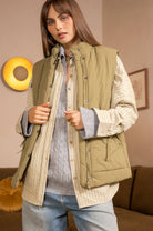 Layer up in effortless style with the Olive Wave Quilted Ribbon Tie-Front Puffer Vest, a must-have transitional layering piece with a modern boho twist. Designed in a rich olive hue, this lightweight puffer vest features a soft wave-pattern quilted texture that adds dimension and visual interest to any outfit. The ribbon tie-front detailing at the waist creates a flattering, adjustable fit while adding a feminine, elevated touch.