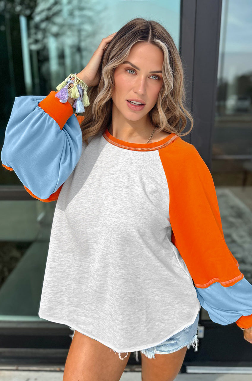 Light Grey Color Block Raglan Sleeve Contrast Stitching Loose Fit Top