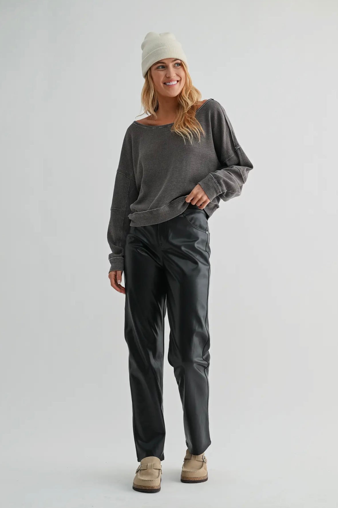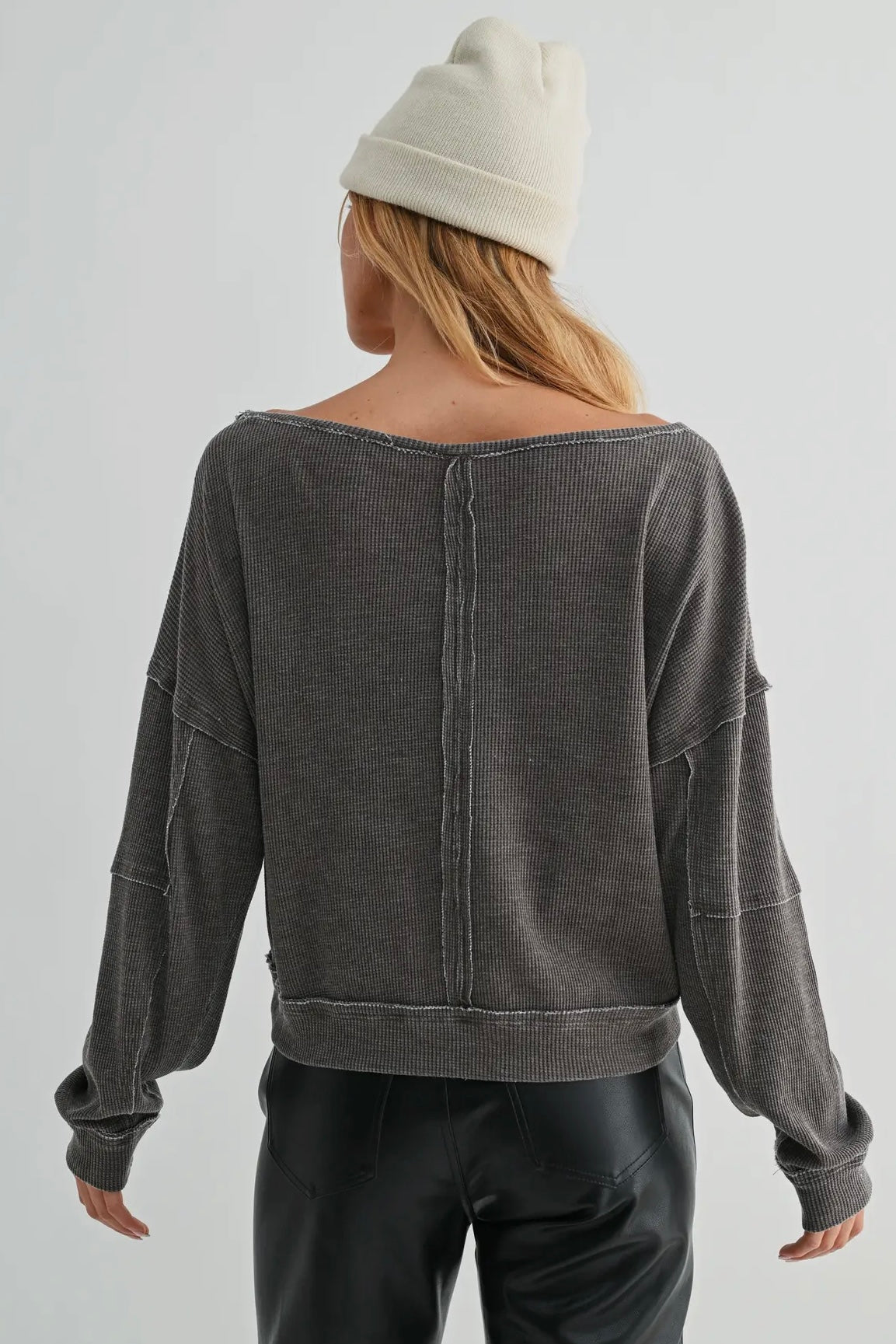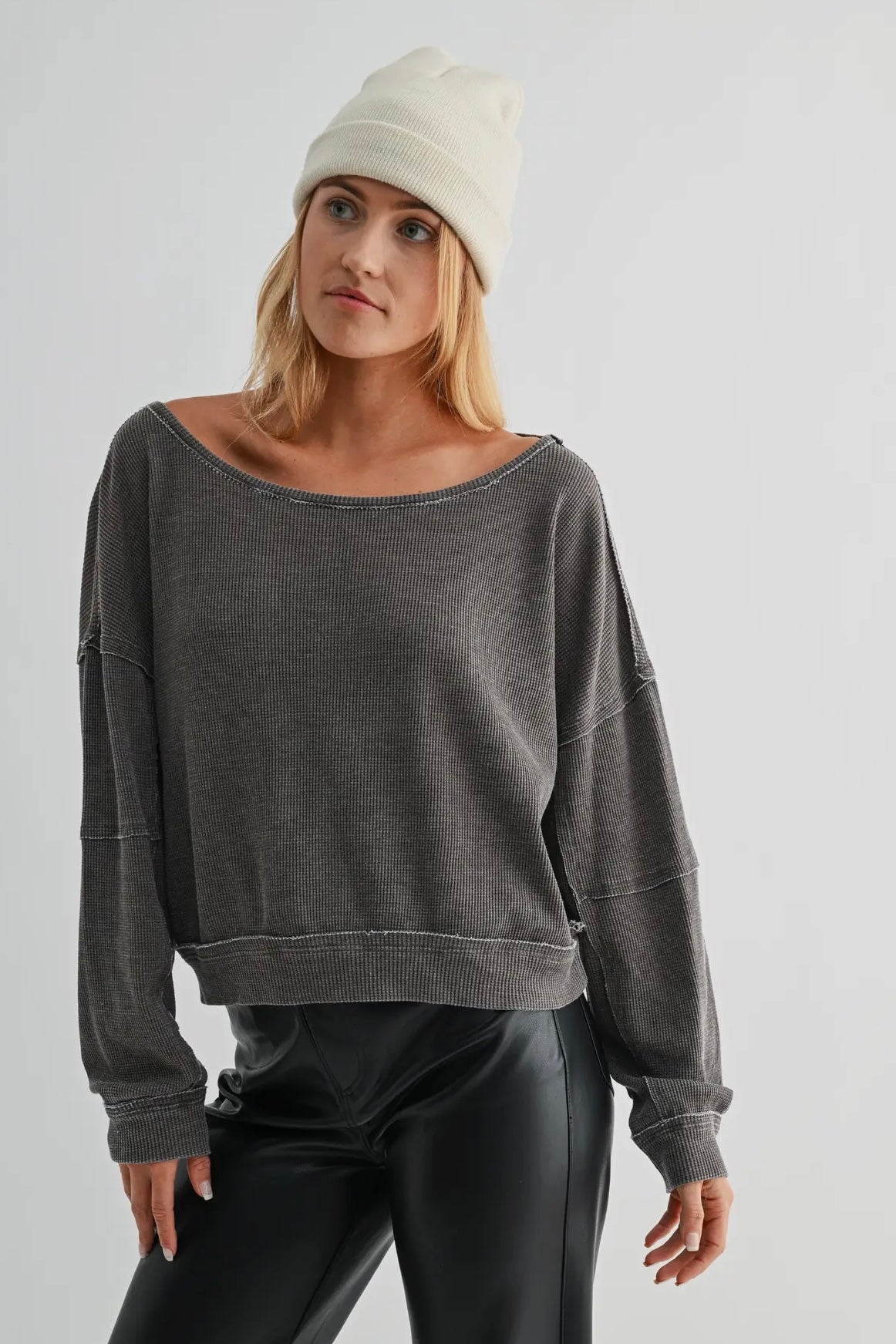A laid-back essential with an edge. This cotton blend boat neck long sleeve features a mineral wash finish for a lived-in look, waffle knit fabrication for texture, and raw edge details that add effortless character. Designed with a drop shoulder, back seam, and sleeve seam accents, it’s the perfect blend of casual comfort and modern detail.