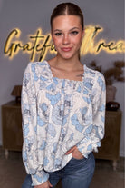 Sky Blue Floral Print Frilly Smocked Square Neck Long Sleeve Blouse