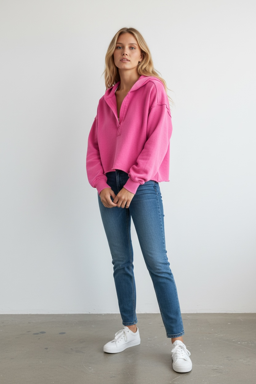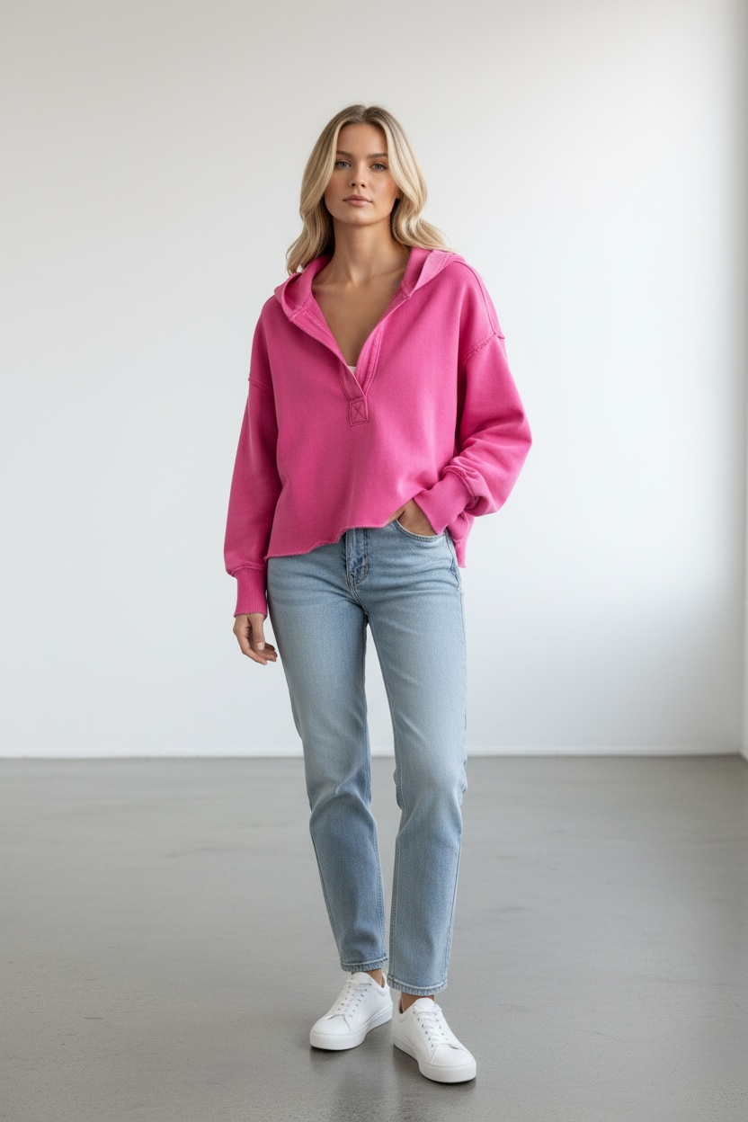 Say hello to your new “throw-on-and-look-cute” essential. This vibrant hot-pink pullover hoodie is made from high-quality polyester, offering a lightweight, breathable, and soft feel that ensures all-day comfort. Features a relaxed fit, ribbed cuffs, and a deep V-notch neckline that gives it that effortless, slightly slouchy vibe we all love. The soft, washed fabric makes it insanely comfortable — perfect for coffee runs, school pickup, or those days you want to be cozy and bold.