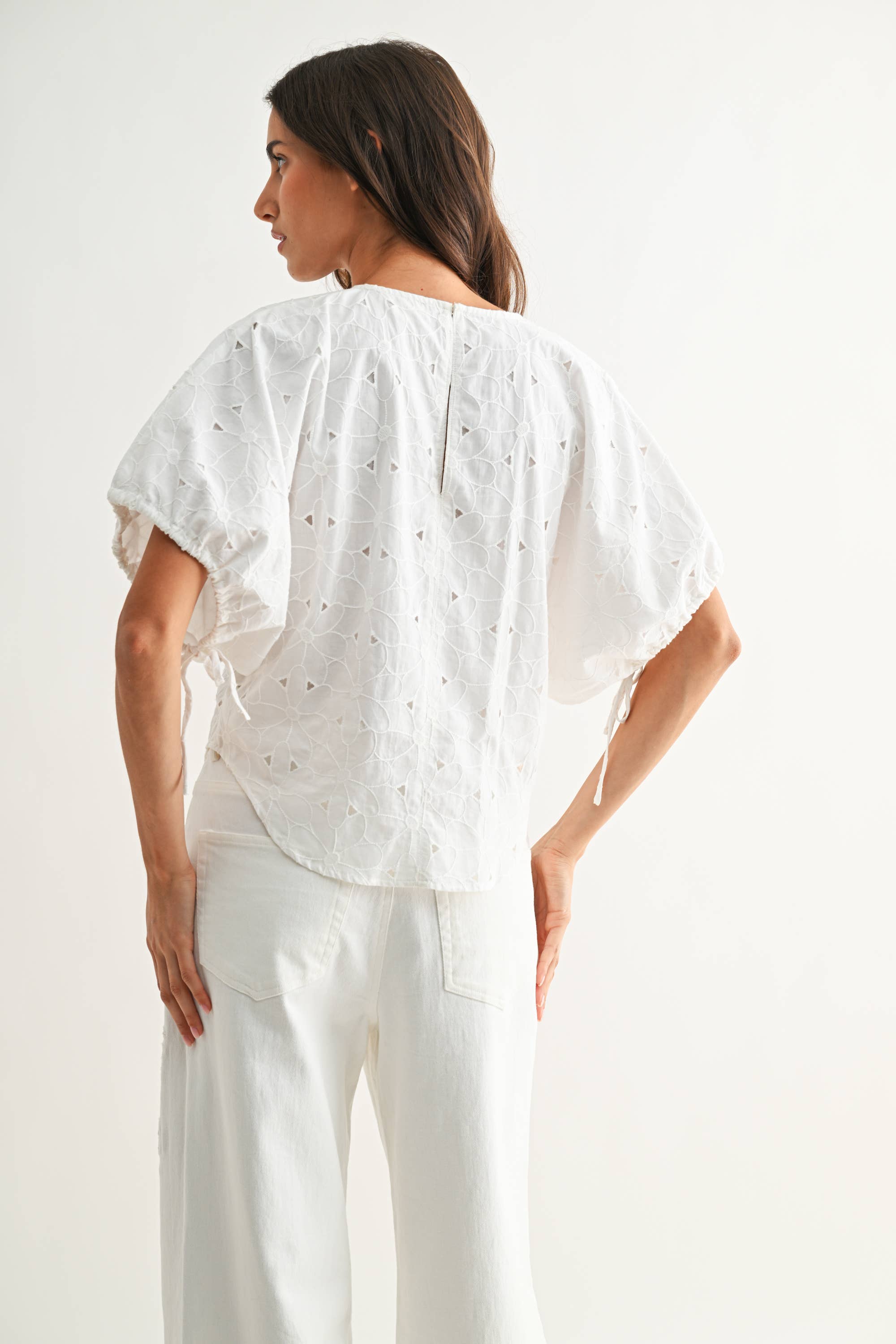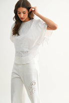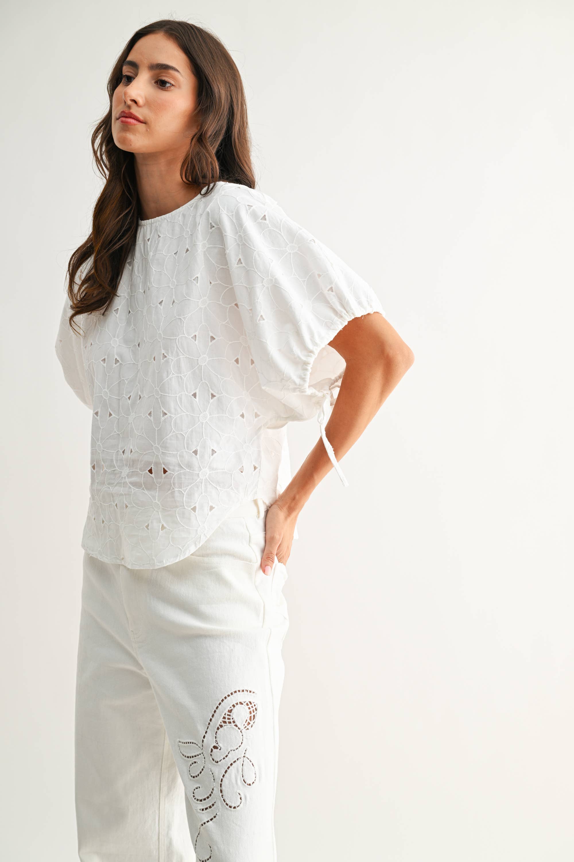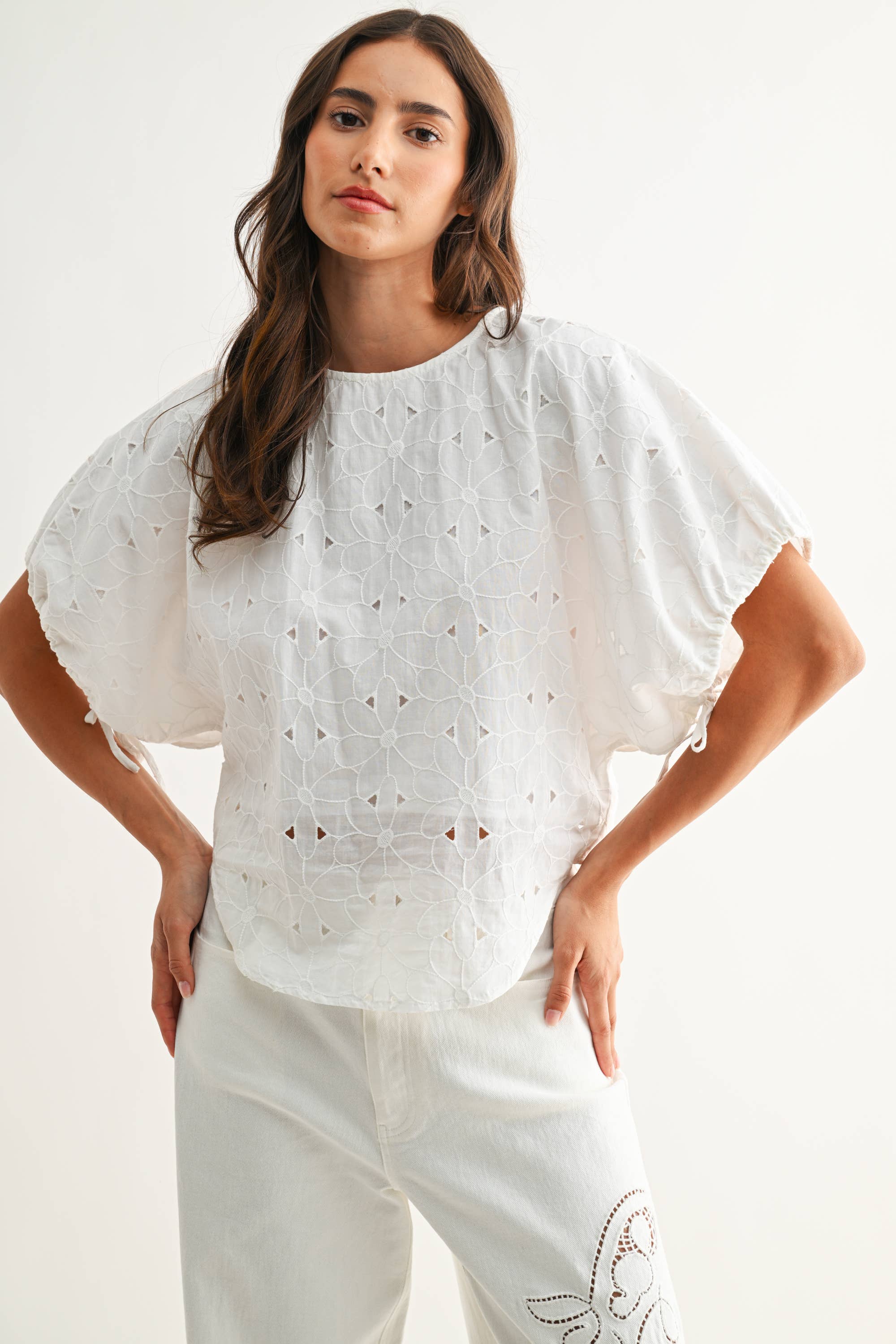 Elevate your everyday style with The Heirloom Stitch Floral Eyelet Cotton Top in off white, a timeless women’s cotton blouse designed for both polished workwear and elevated casual styling. Crafted from 100% breathable cotton, this embroidered eyelet blouse features intricate floral throughout for a soft, feminine finish that adds texture without sacrificing versatility. The relaxed silhouette offers effortless comfort for all-day wear, while flutter sleeves and a clean neckline create a refined shape perfect for pairing with trousers, denim, or skirts.
