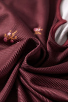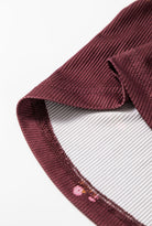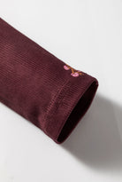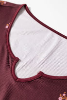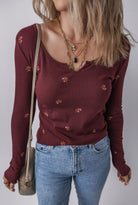 Burgundy Notched Neck Floral Print Ribbed Long Sleeve Top