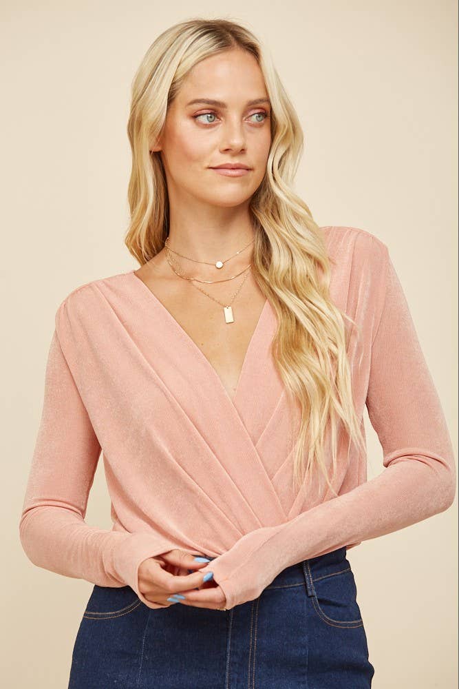 Wisteria Lane - Soft Blush Slinky Surplice Long Sleeve Bodysuit