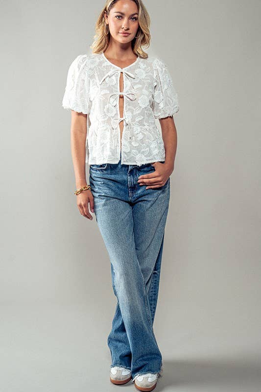 En Crème White & Blue Puff Sleeve Peplum Top with Embroidery Detail