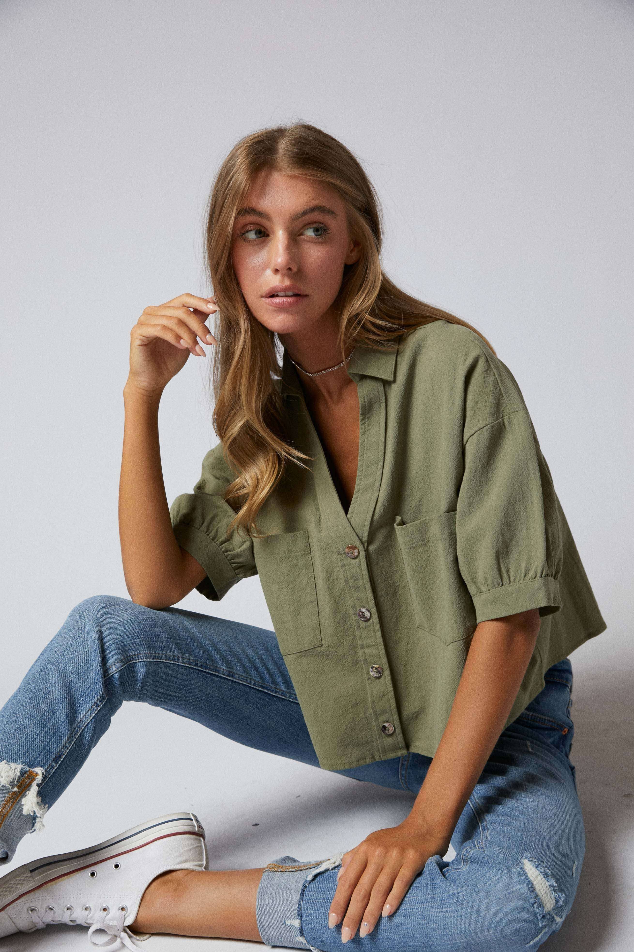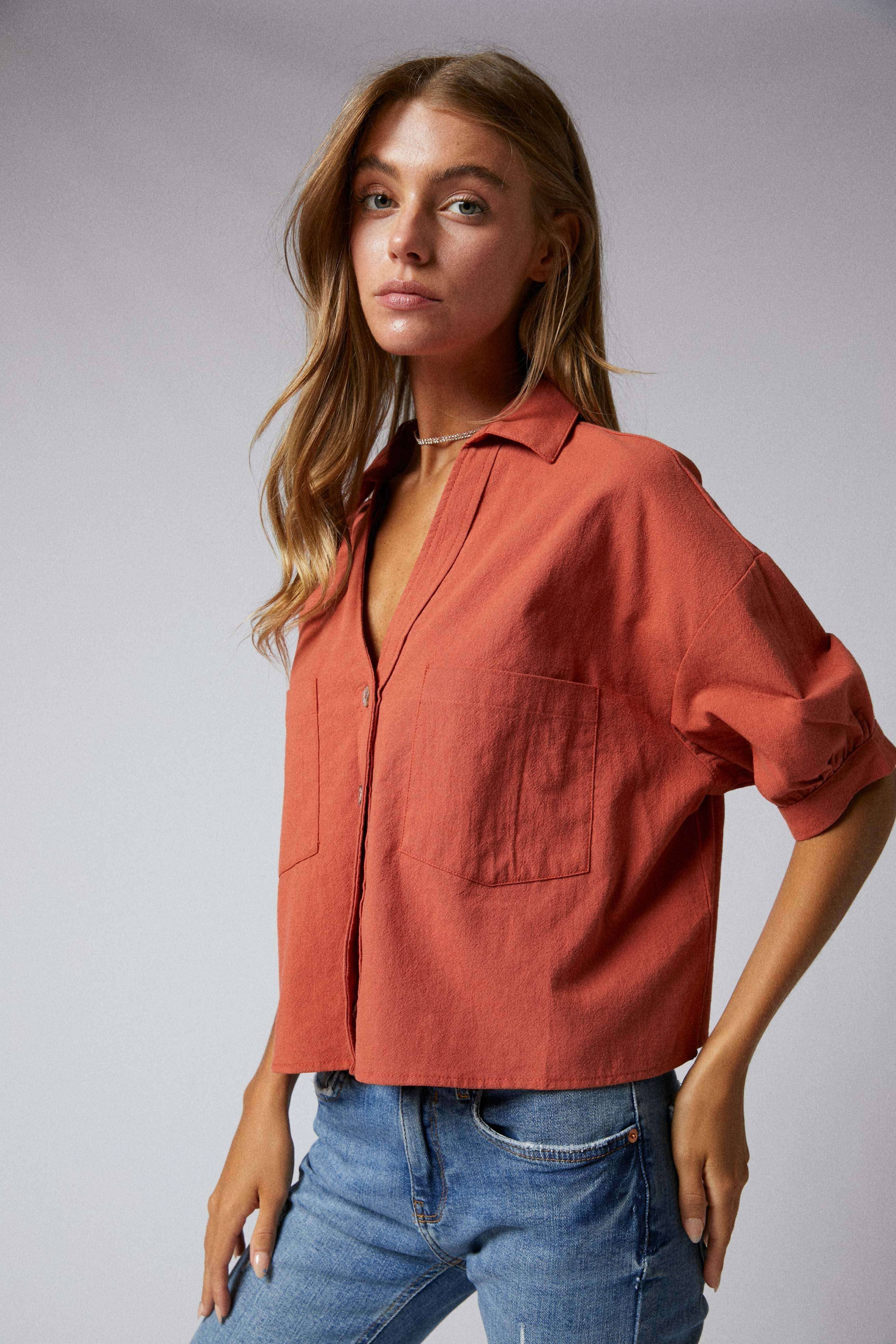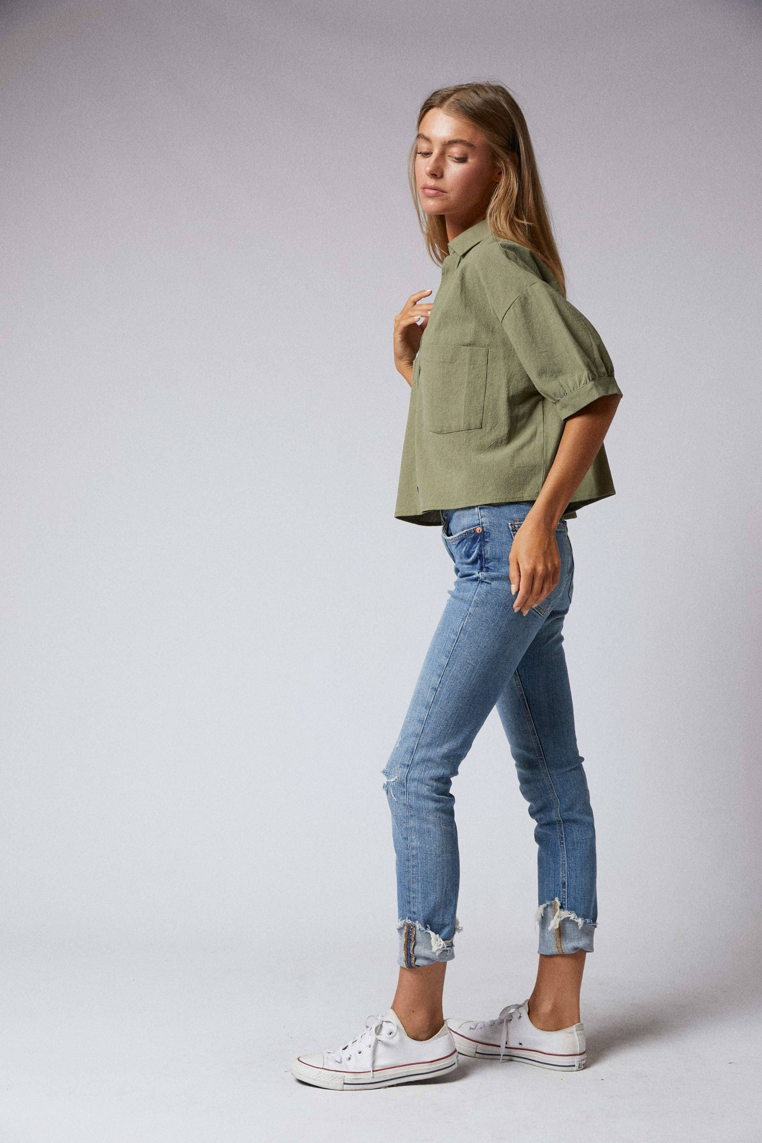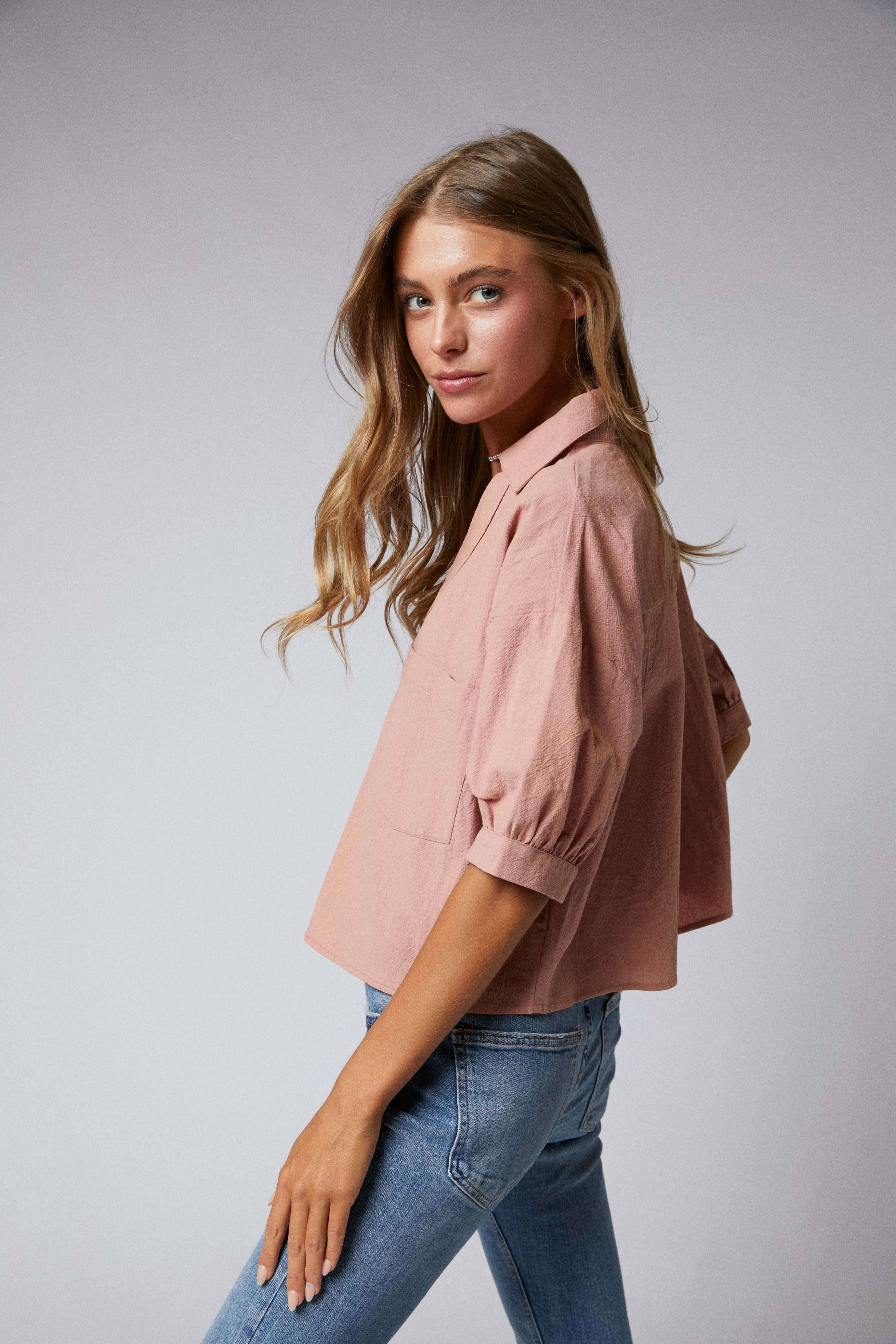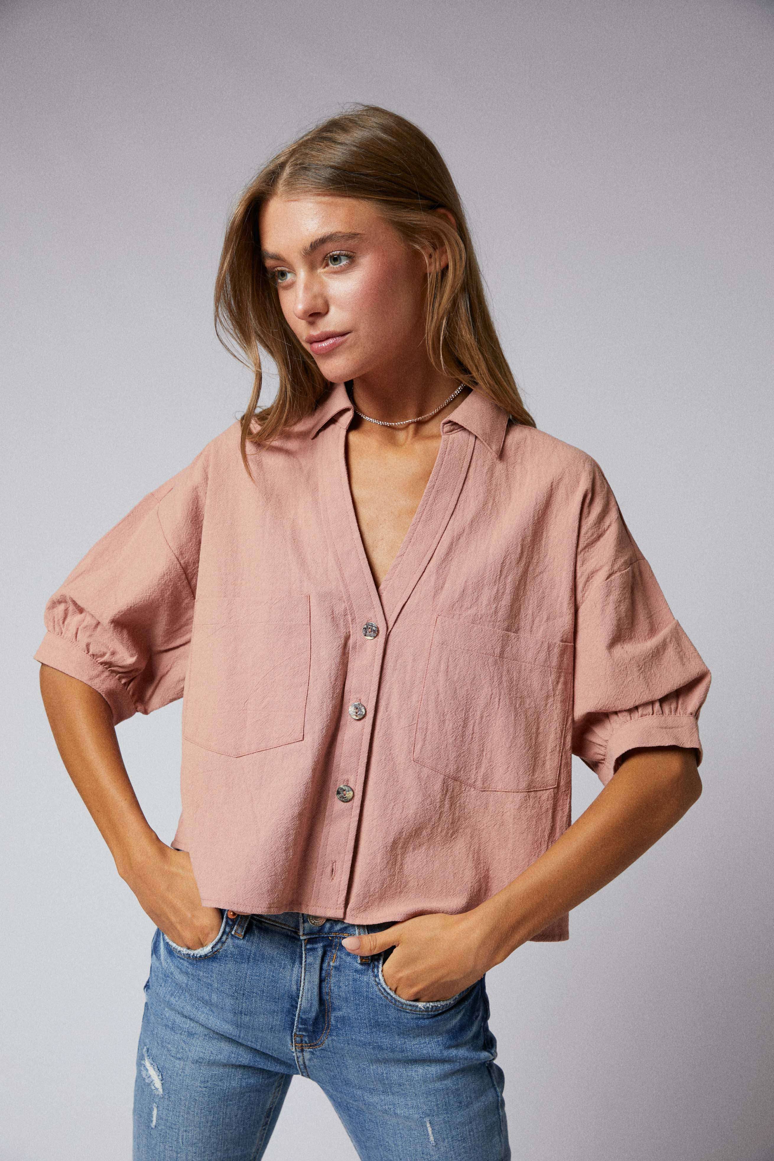 Elbow Sleeves Button Down 2 Pocket Crop Shirt