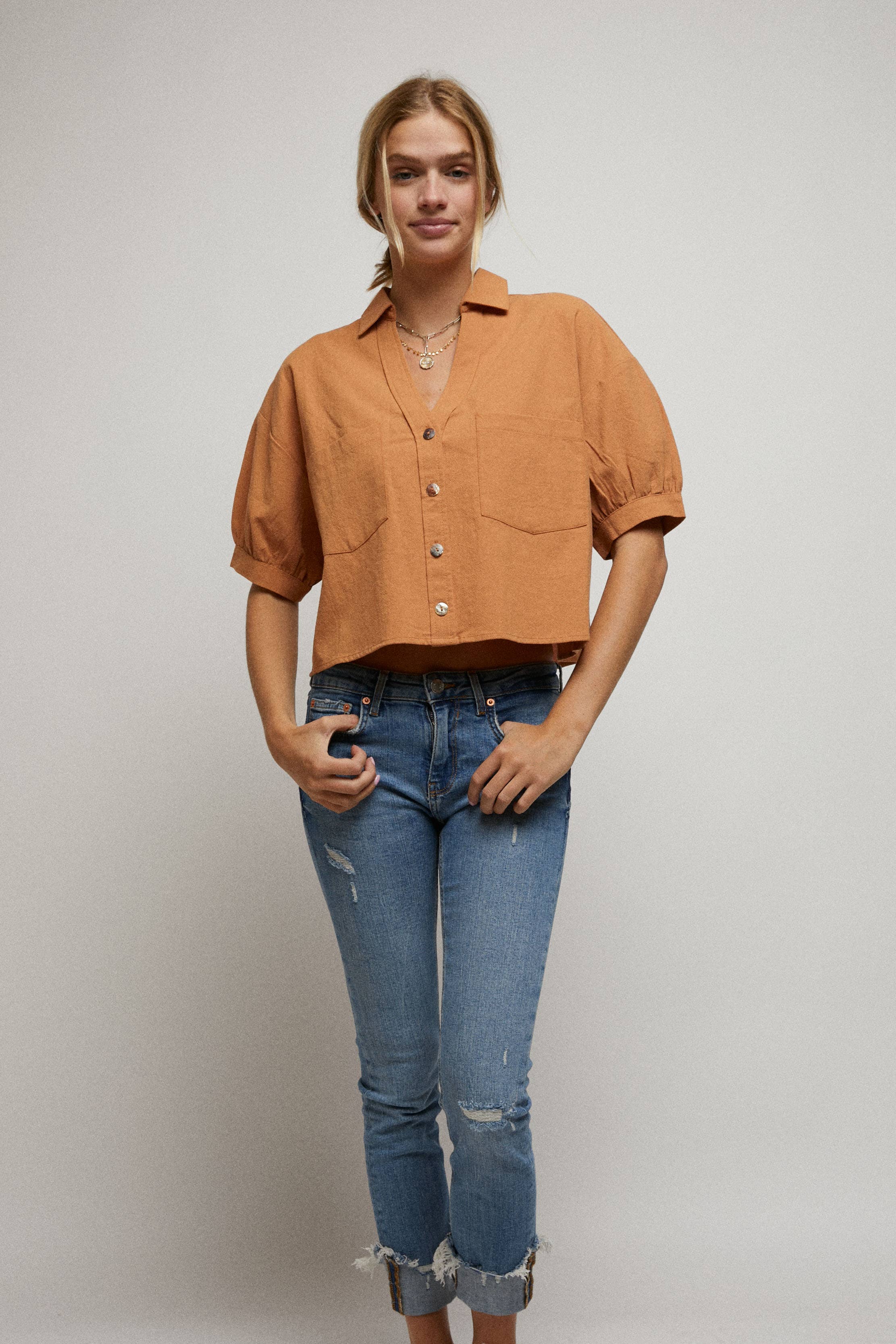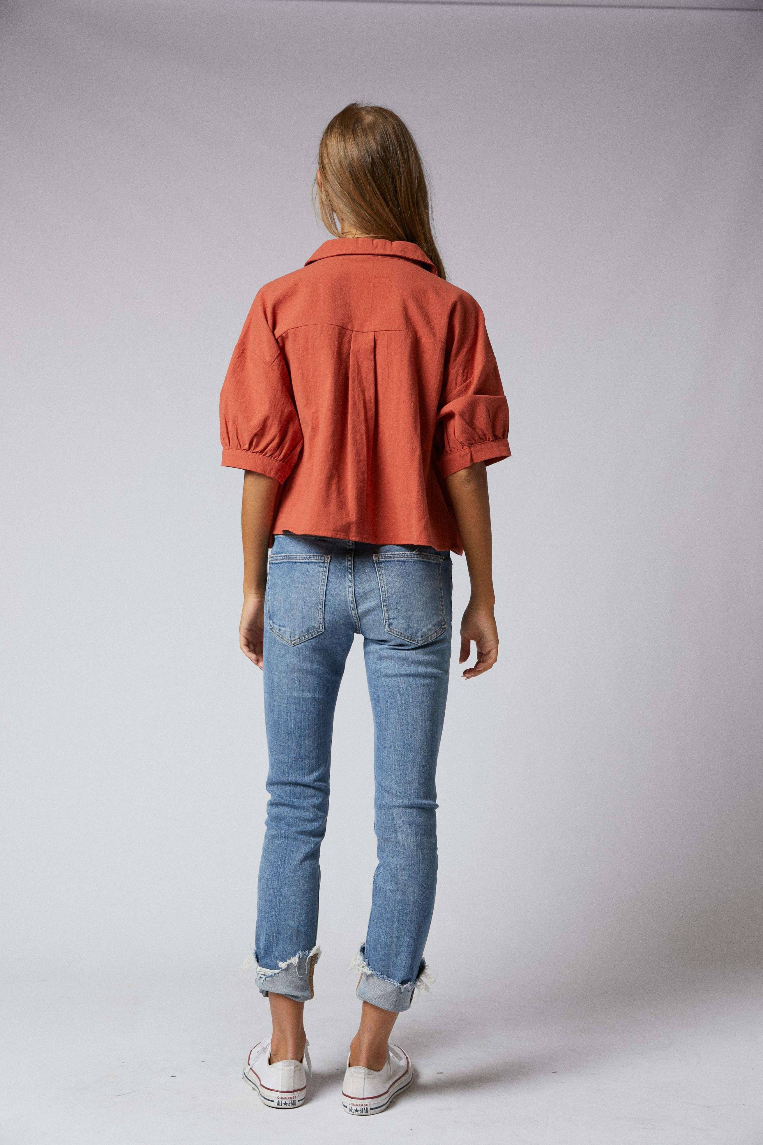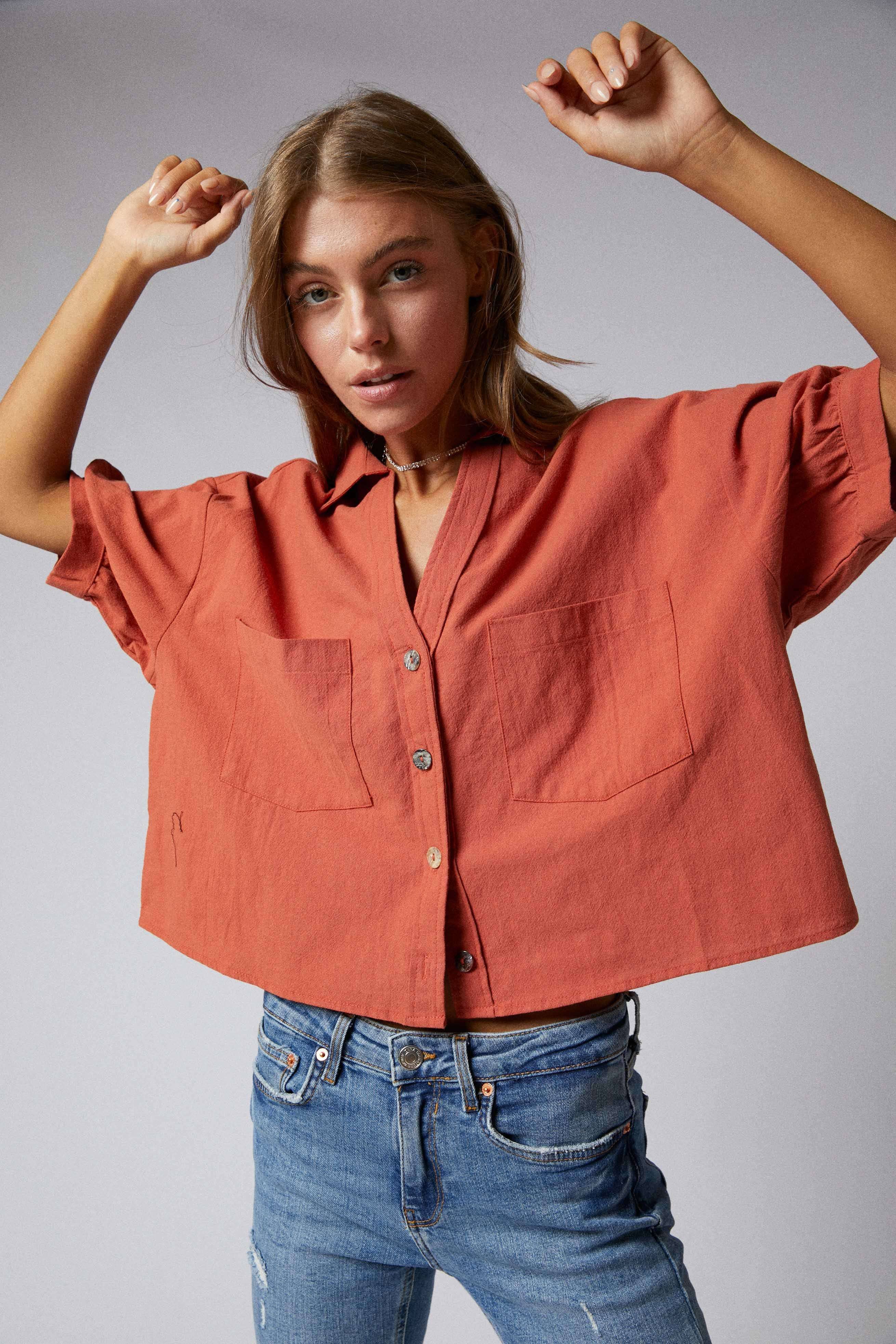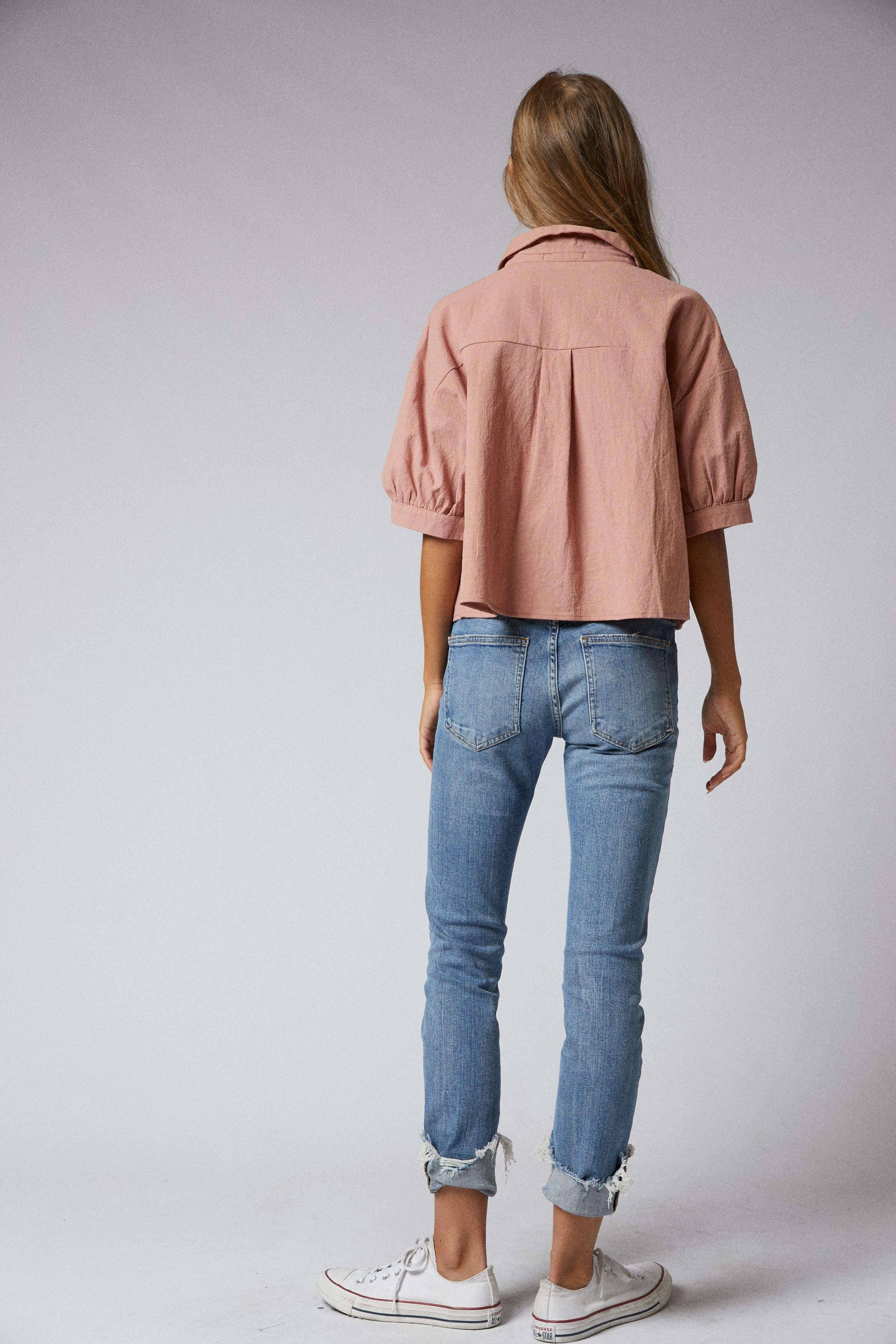 Elbow Sleeves Button Down 2 Pocket Crop Shirt