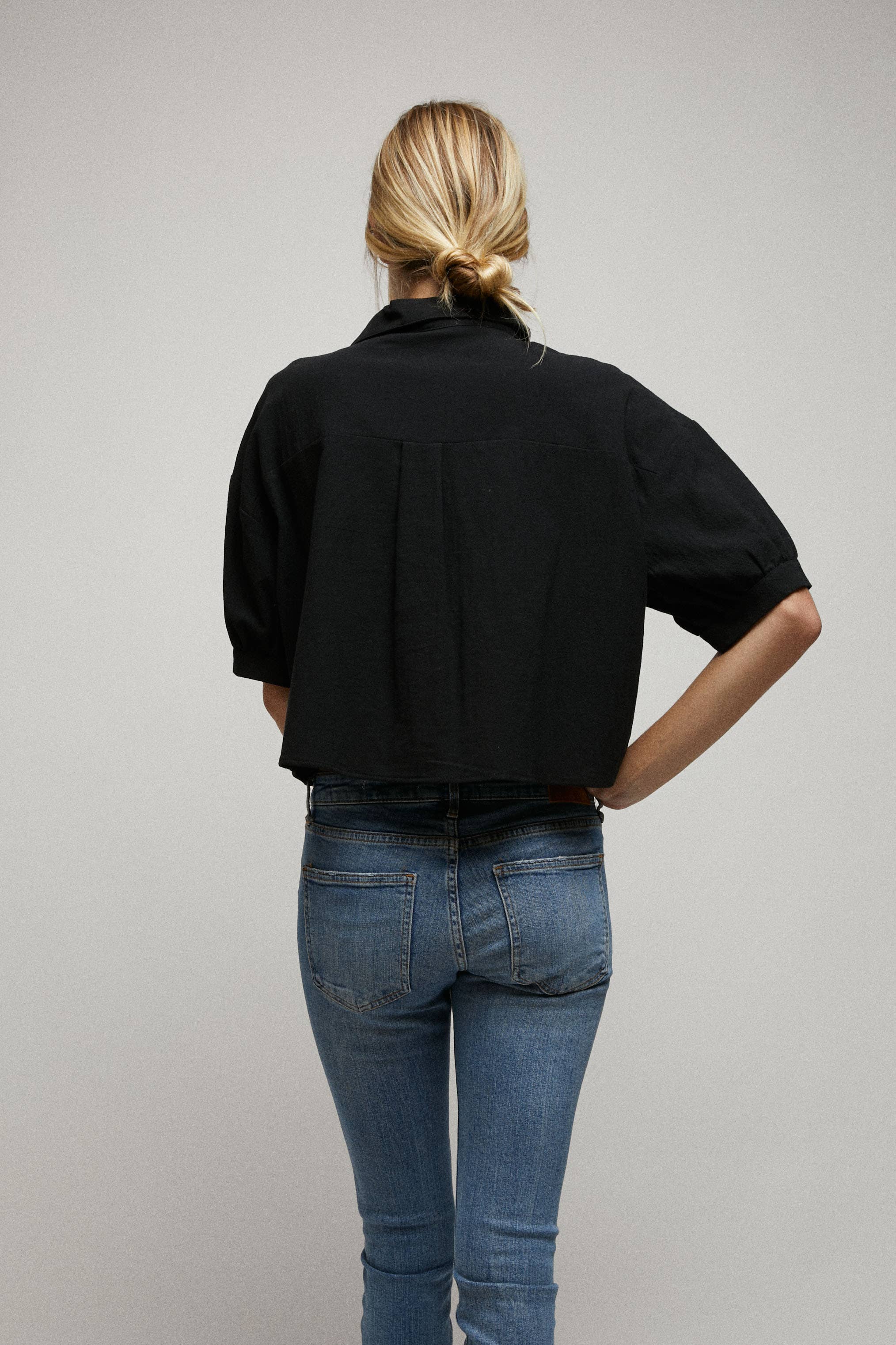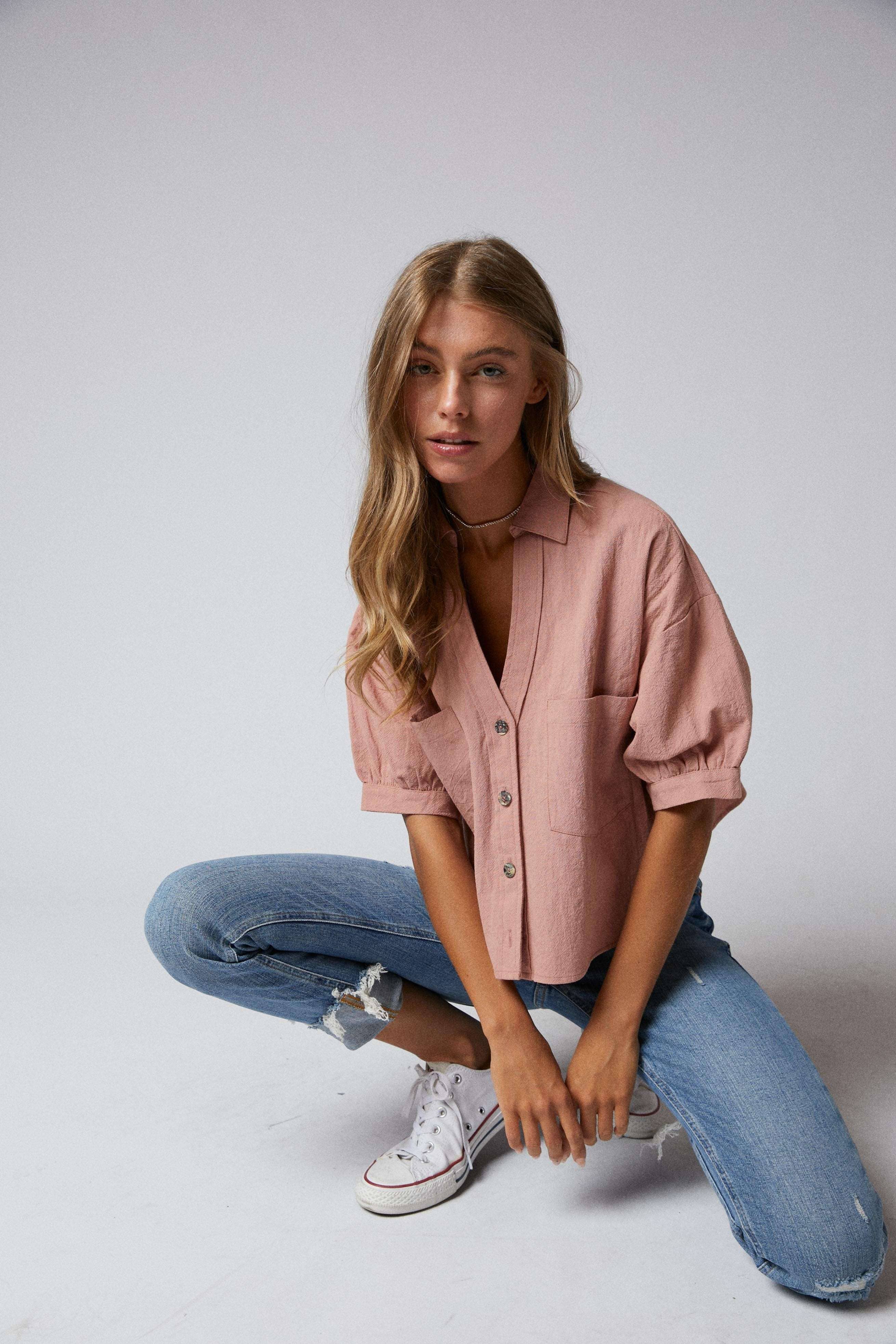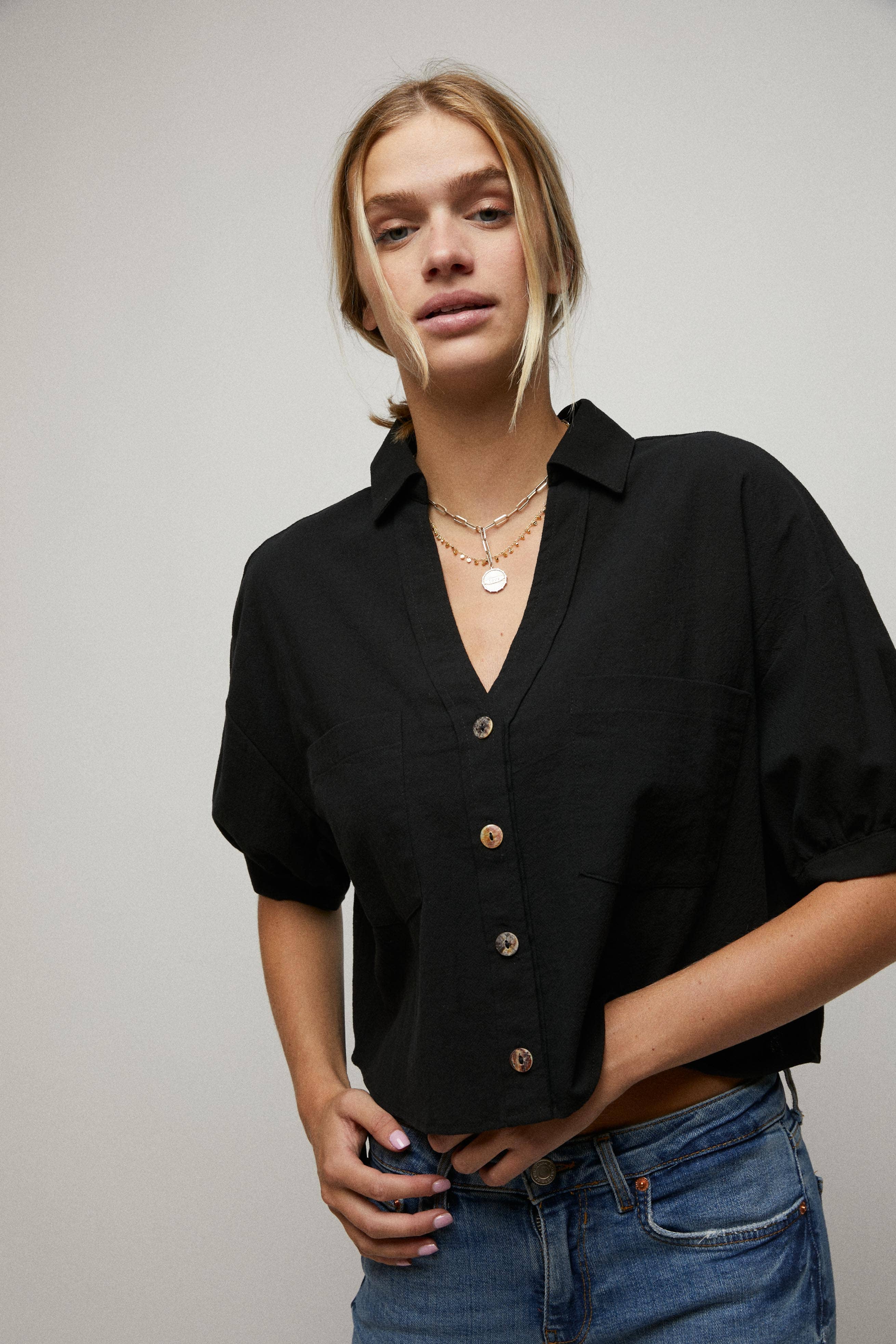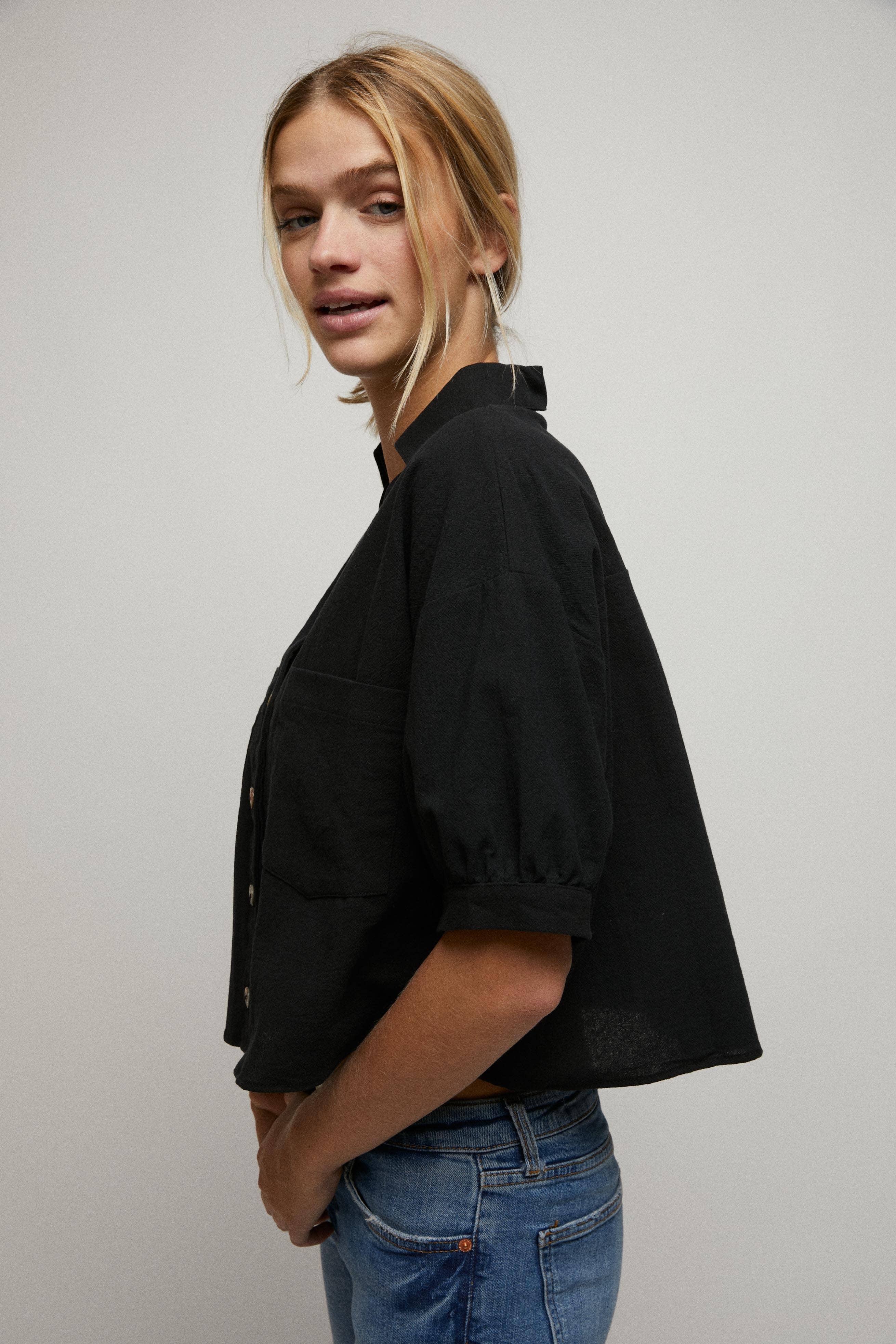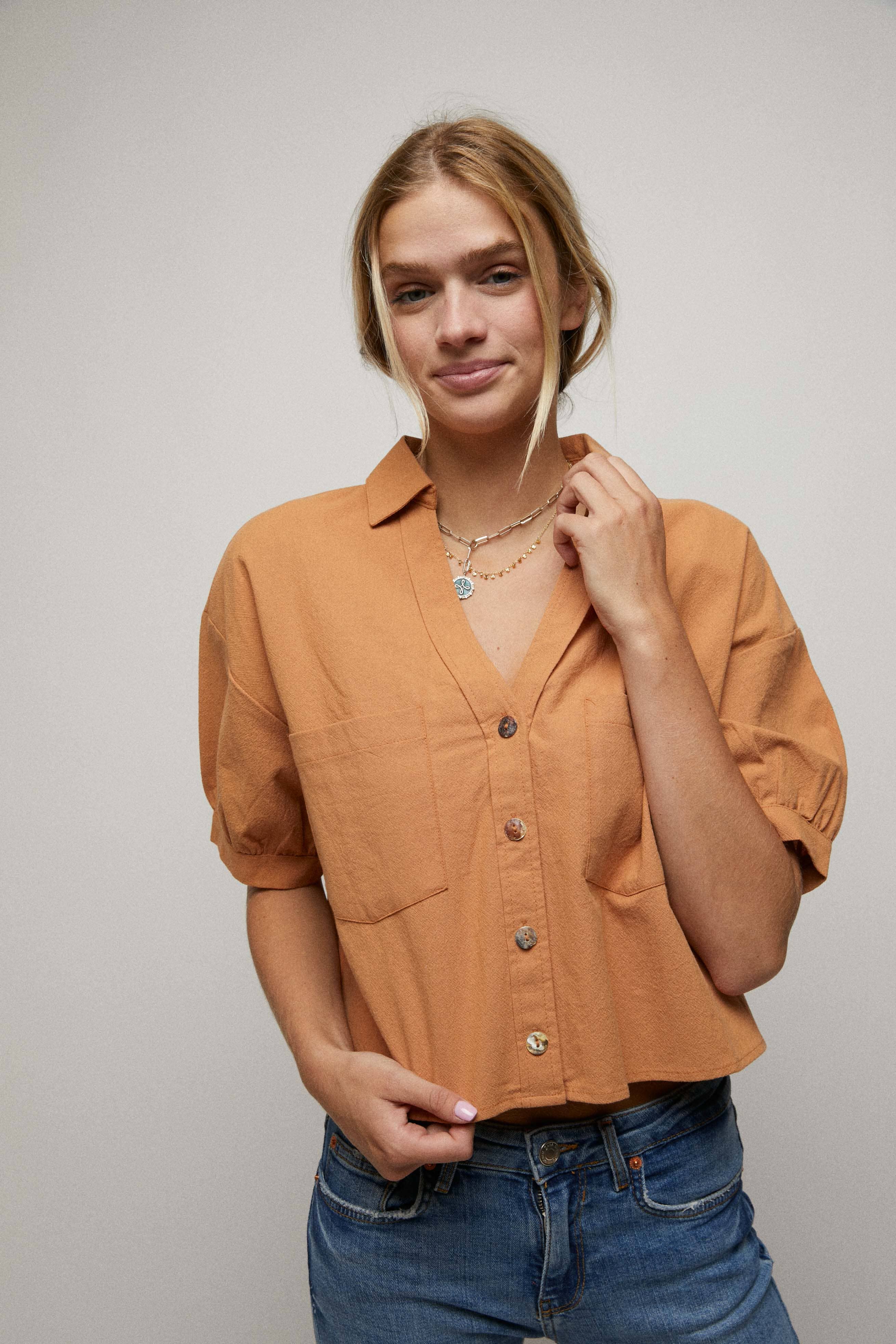 Elbow Sleeves Button Down 2 Pocket Crop Shirt