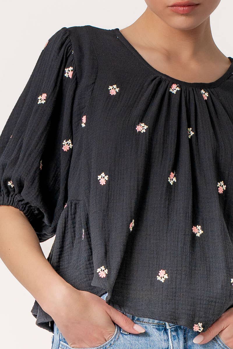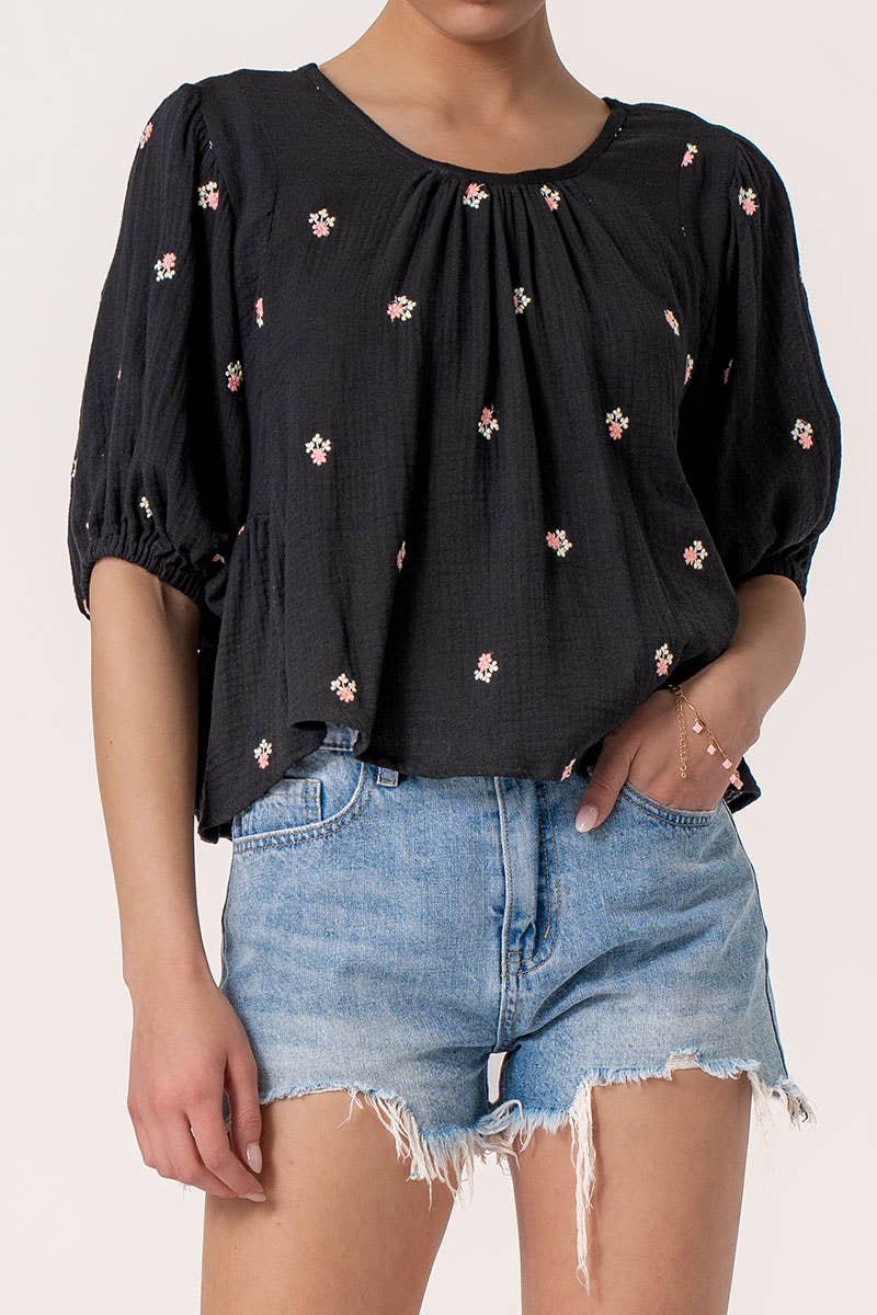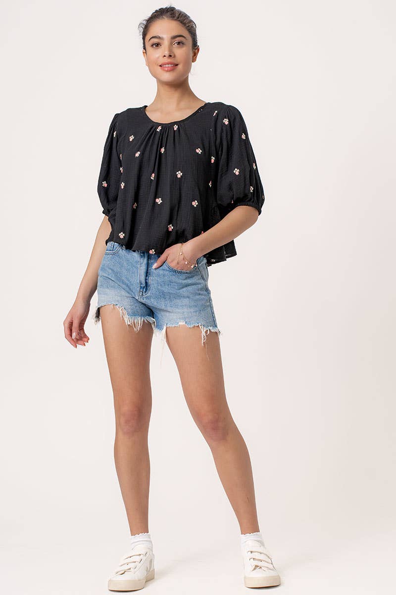 Rhinestone Pearl Puff Half Sleeve Top