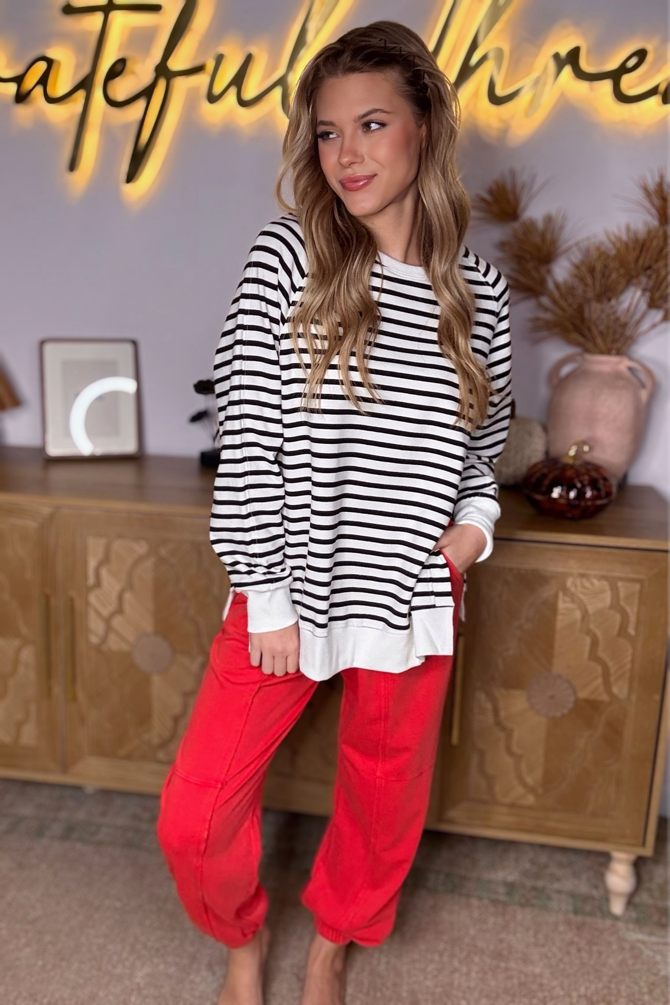 Black & White Stripe Round Neck Drop Shoulder Long Sleeve Blouse