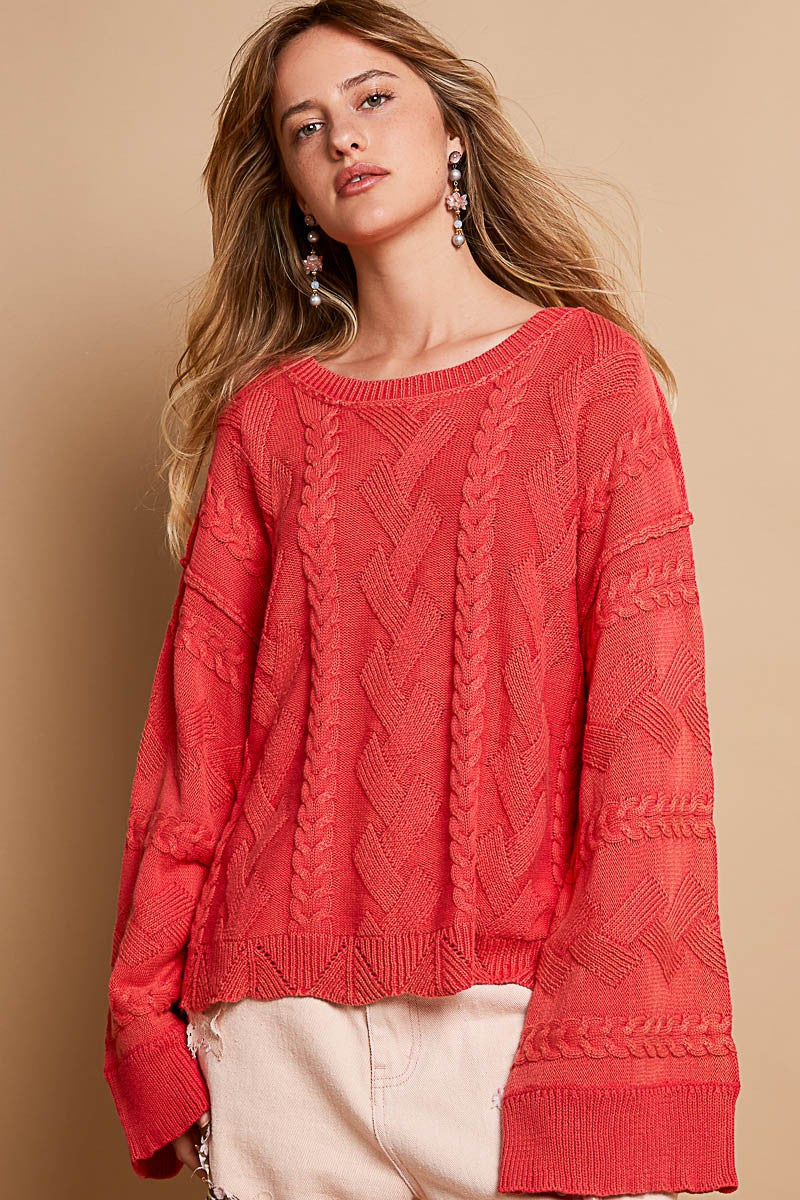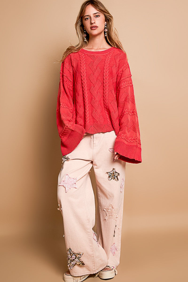 POL Oversized Textured Vintage Washed Sweater in Cherry Red