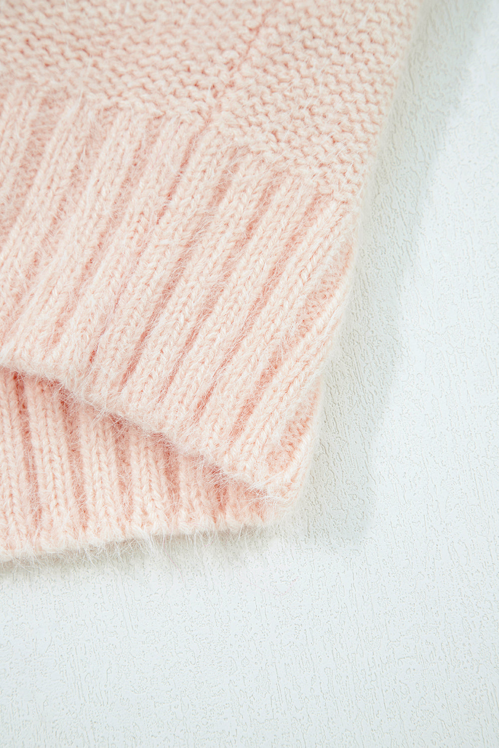 Bright Pink Trendy Pattern Knit Ribbed Cuffs Crew Neck Sweater