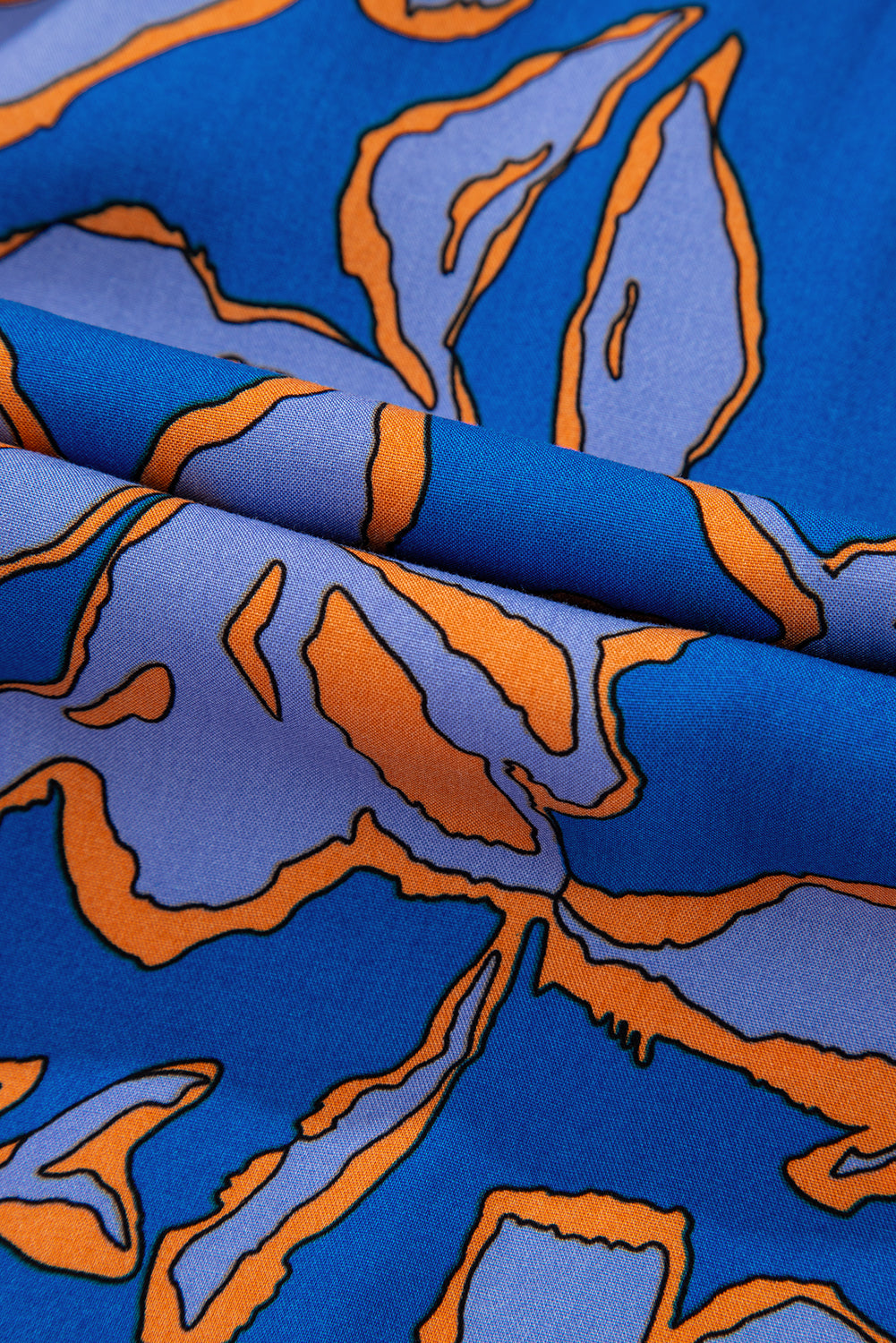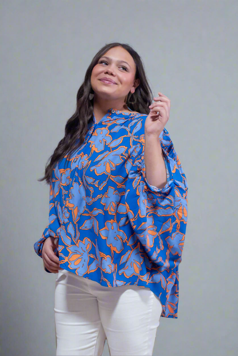 Blue & Orange Floral Batwing Sleeve Button-Up Loose Fit Blouse
