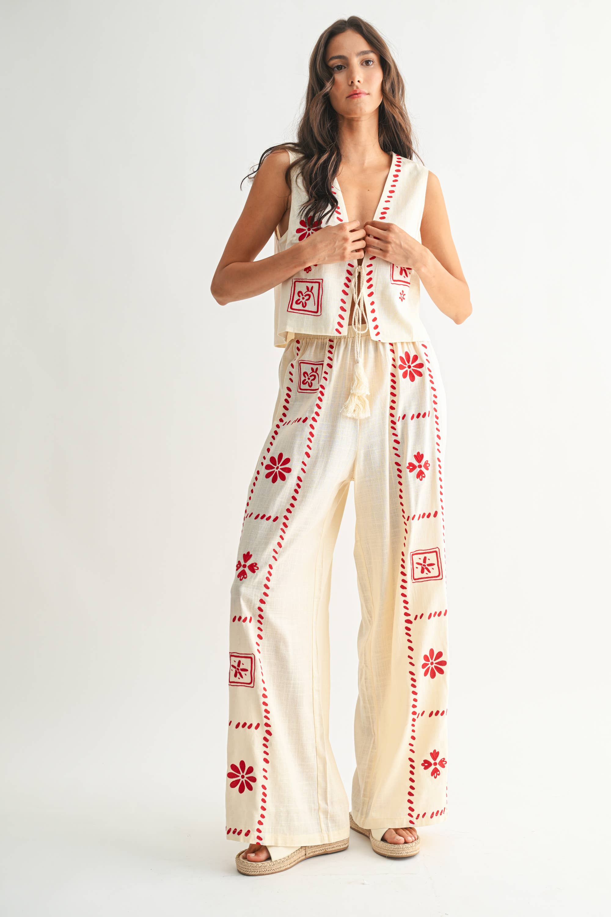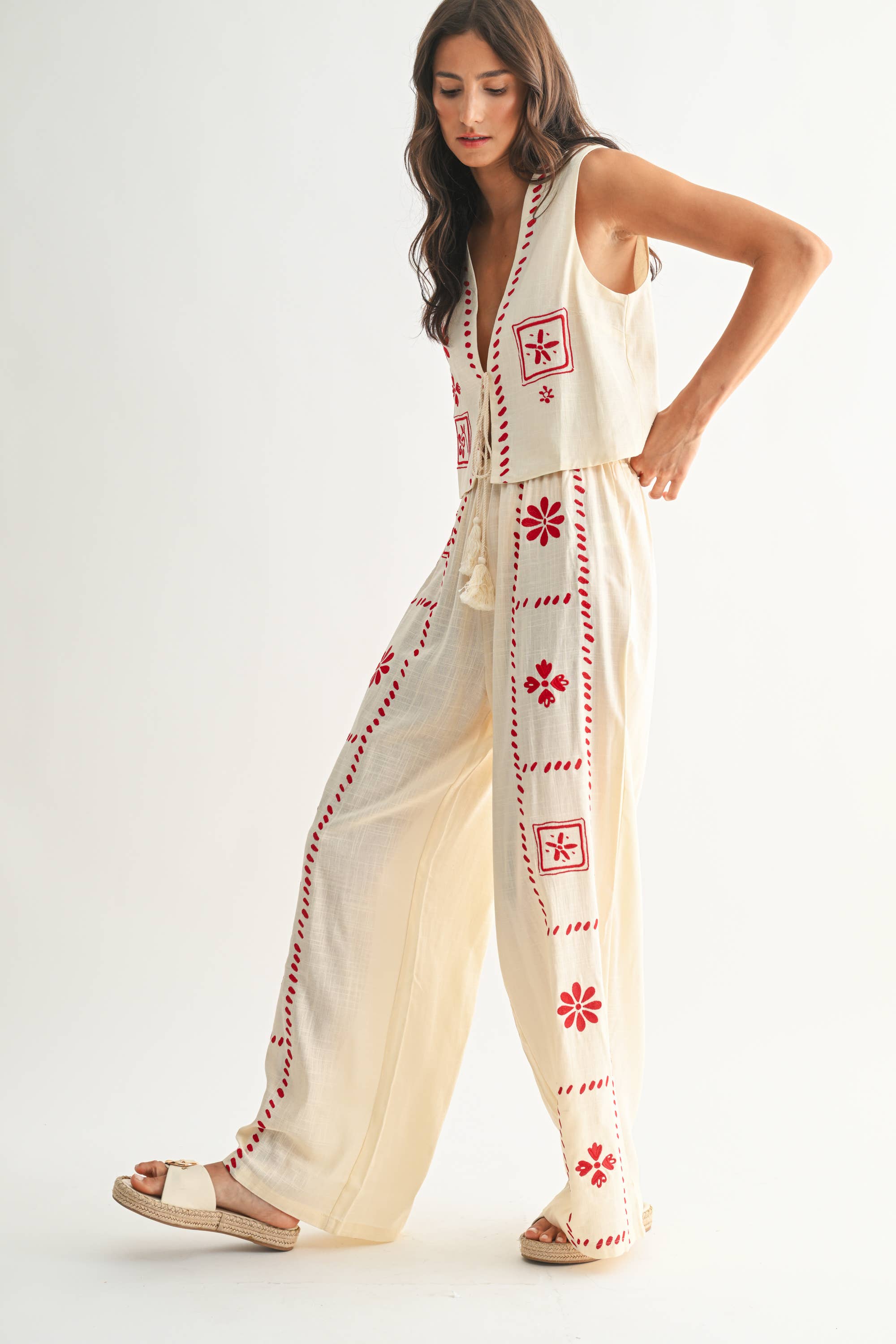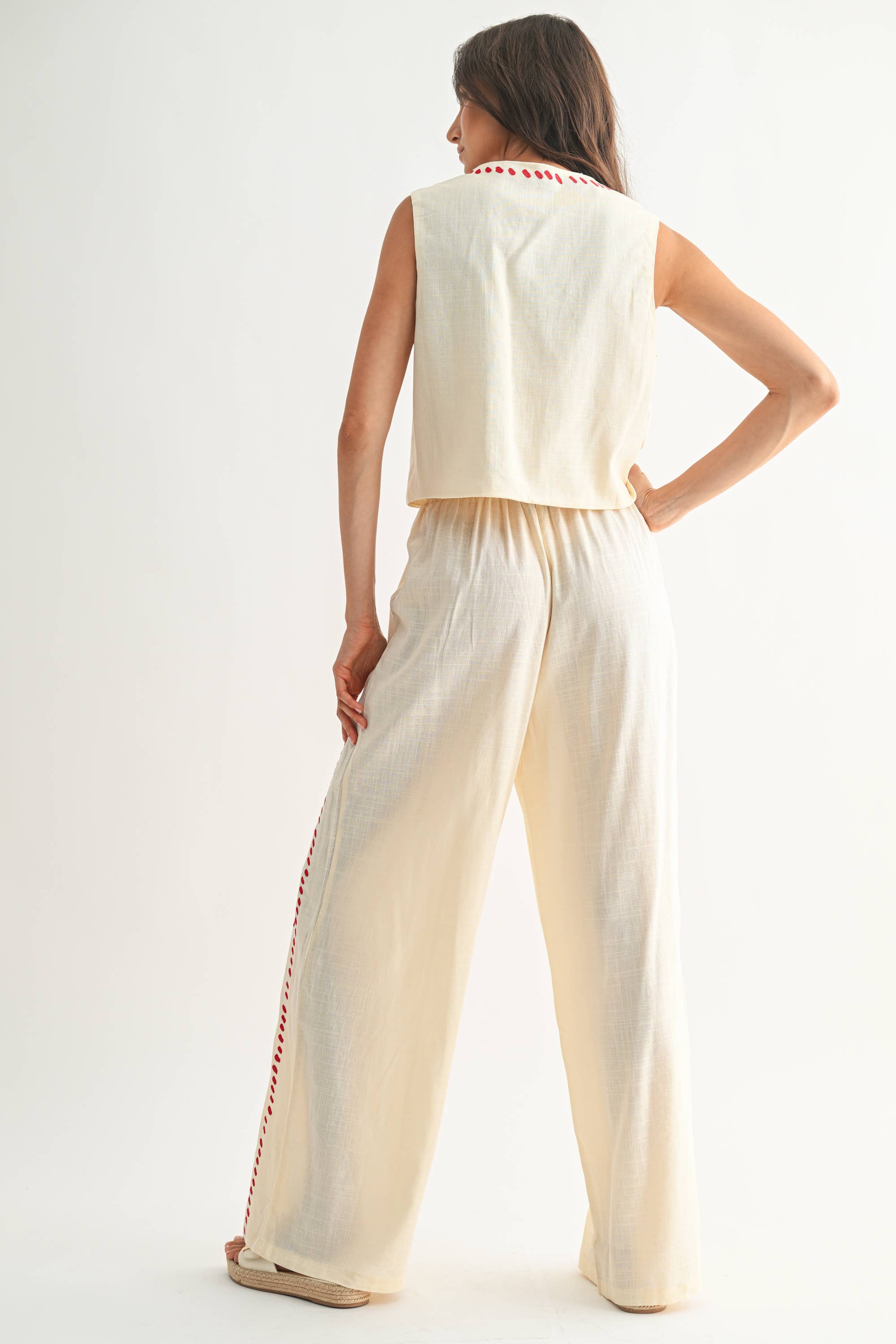 The Scarlet Stitch Linen Vest & Pant Set – Cream/Red