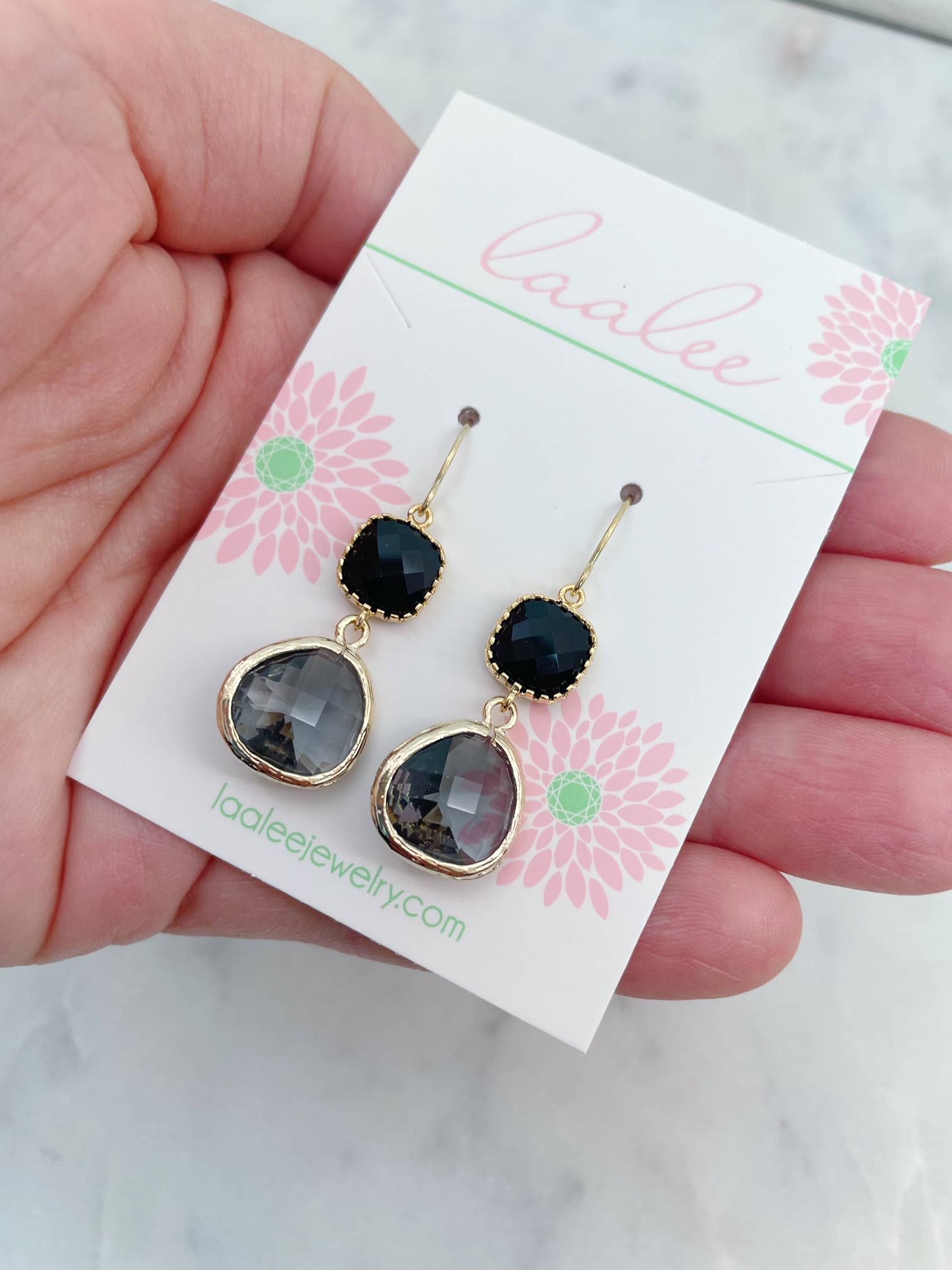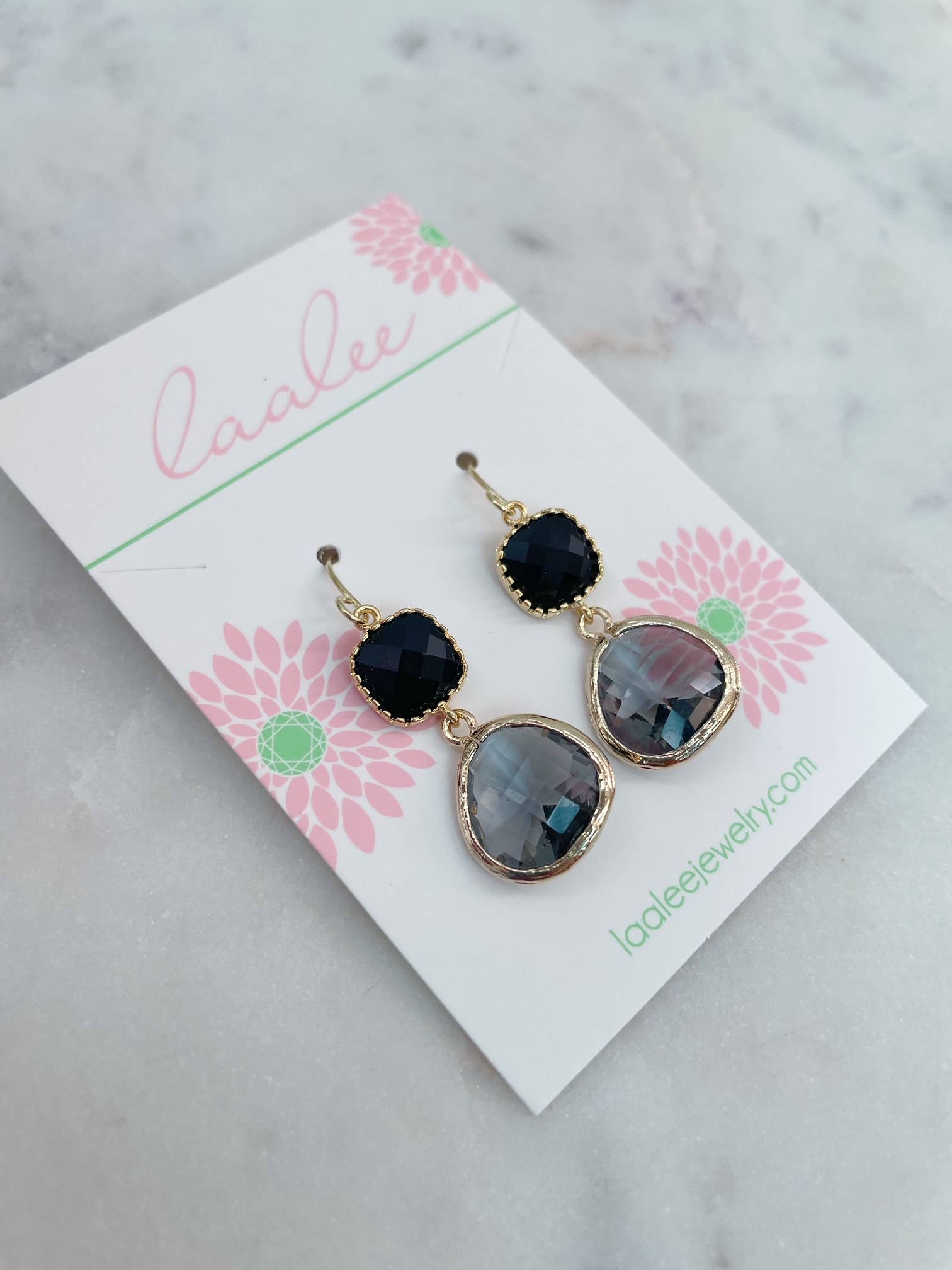 Beautiful black and grey glass gem earrings measuring approx 1.25" with 14k gold filled earwires.