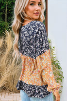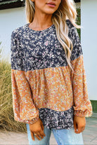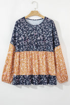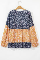Blue Floral Color Block Patchwork Ruffled Hem Round Neck Blouse