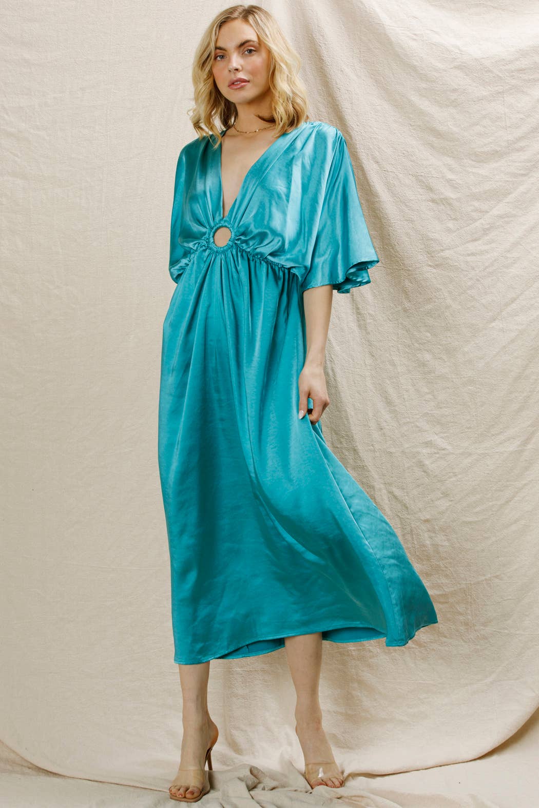 En Crème Aqua V-Neck Satin Maxi Dress with O-Ring Detail