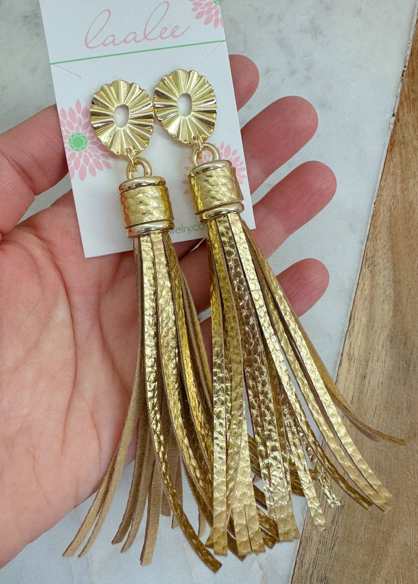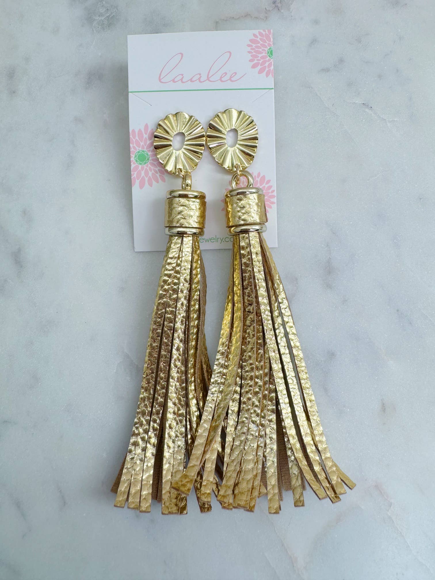 Very long and mega statement gold tassel earrings with a gold wavy stud! Measures approx ~6" long!