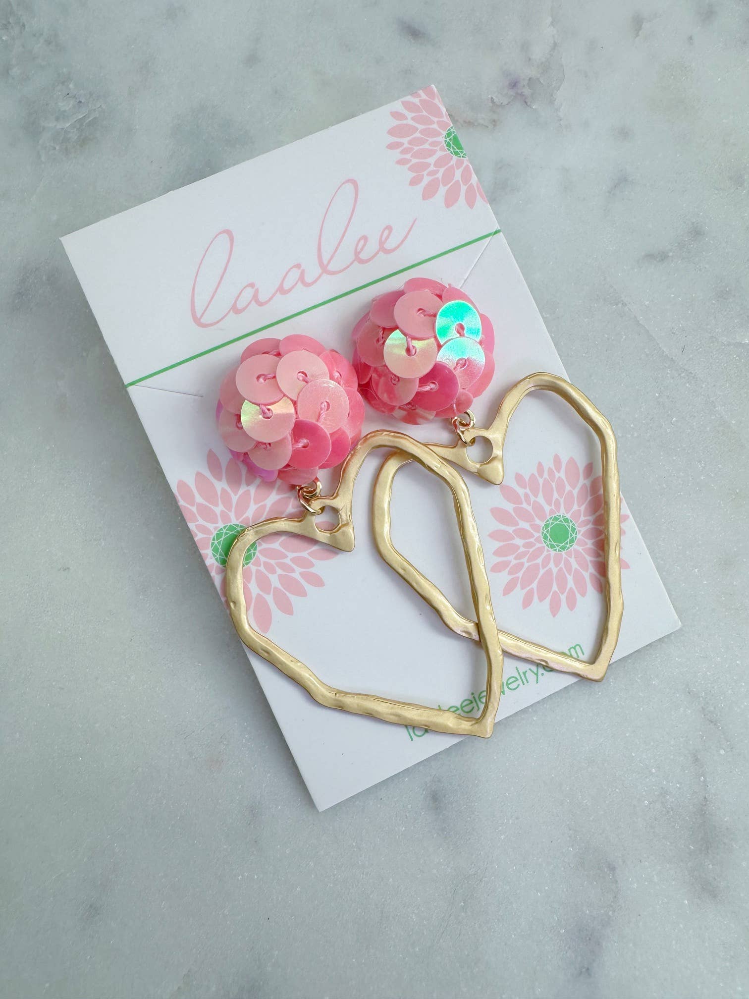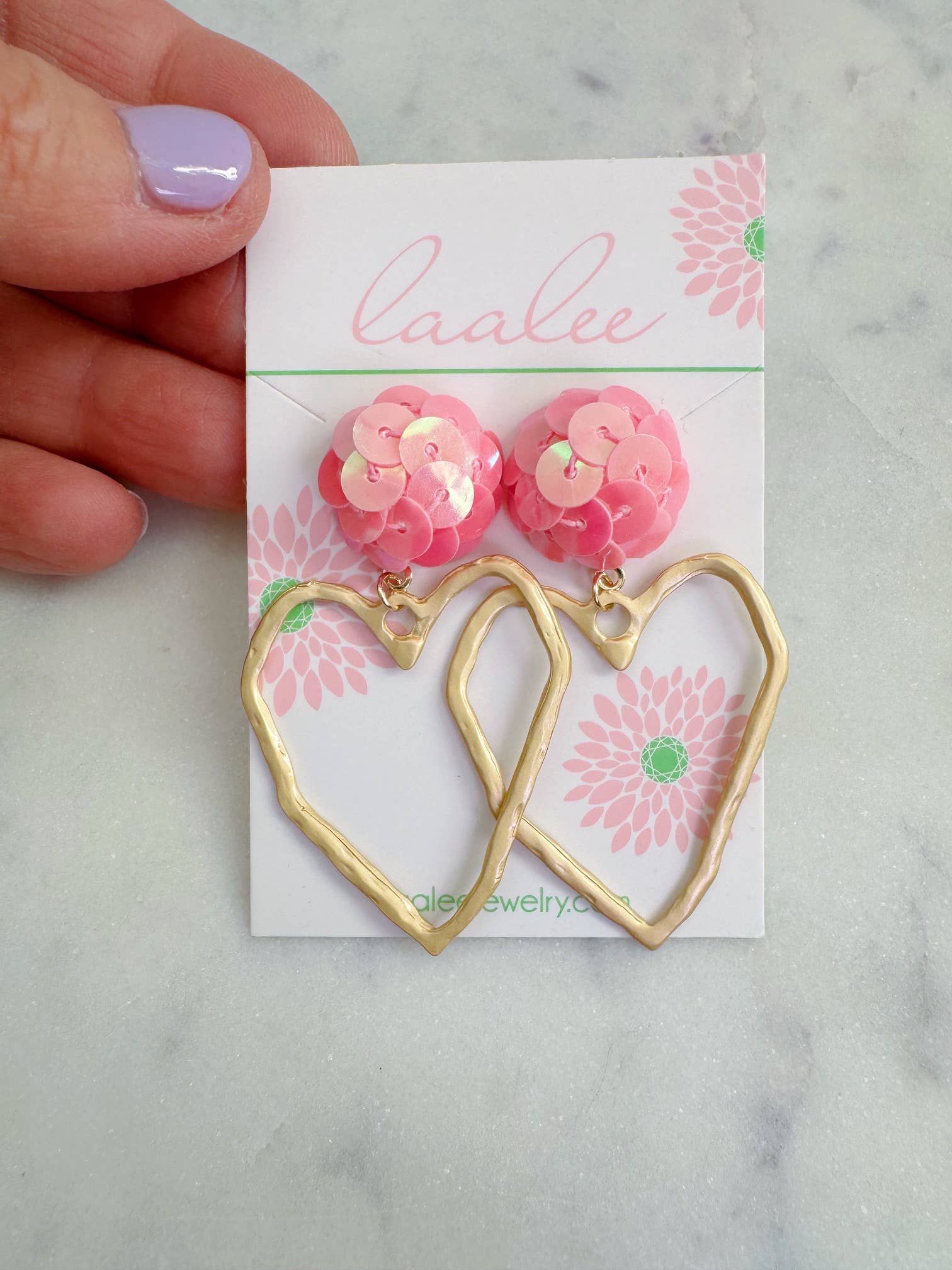 Beautiful sequined earrings with a gold heart. Earrings are studs that measure approximately 2". Perfect as spring jewelry, summer jewelry, Valentine's Day jewelry, graduation gifts, Mother's Day, or just for fun! Makes a great gift.