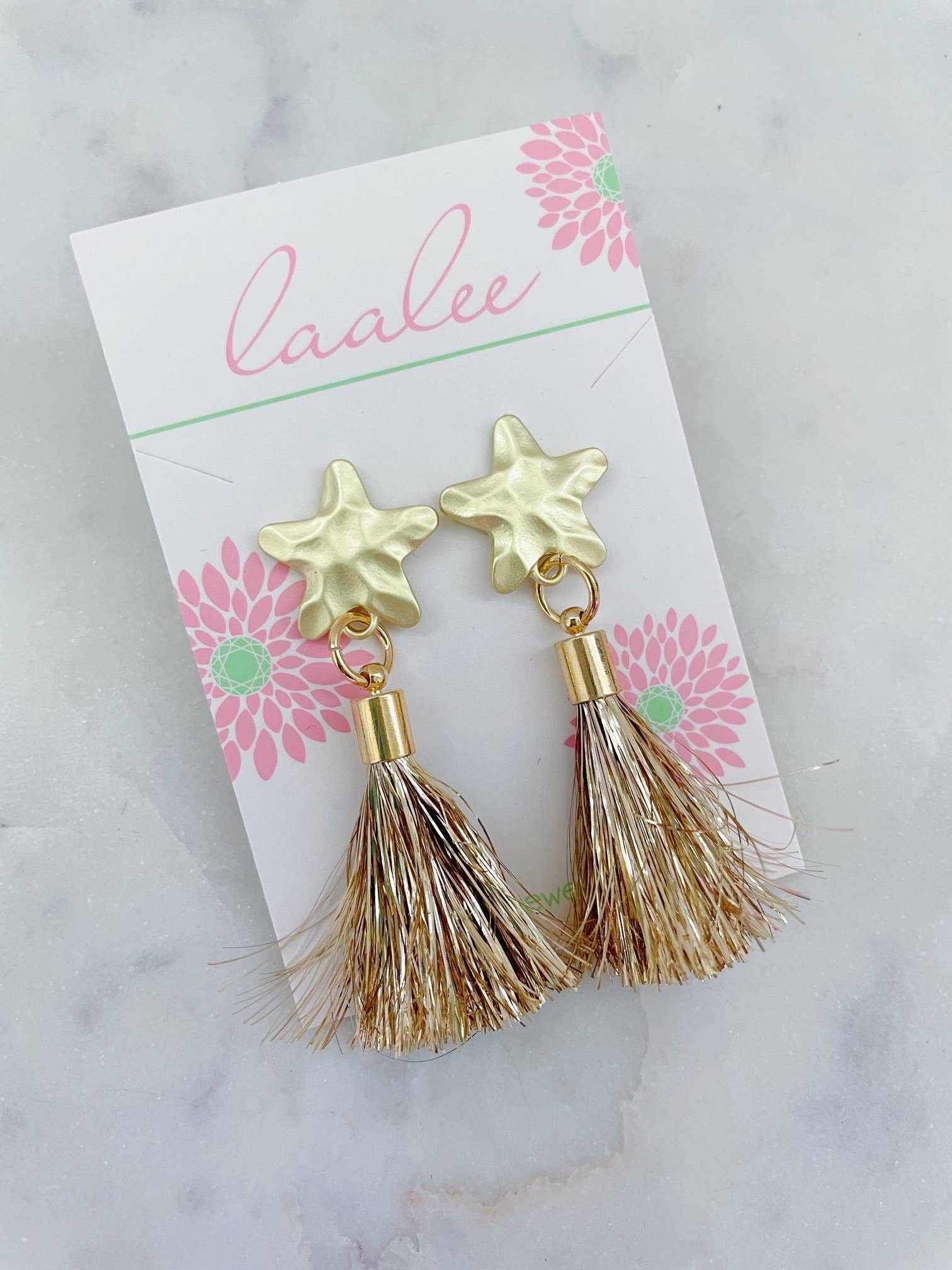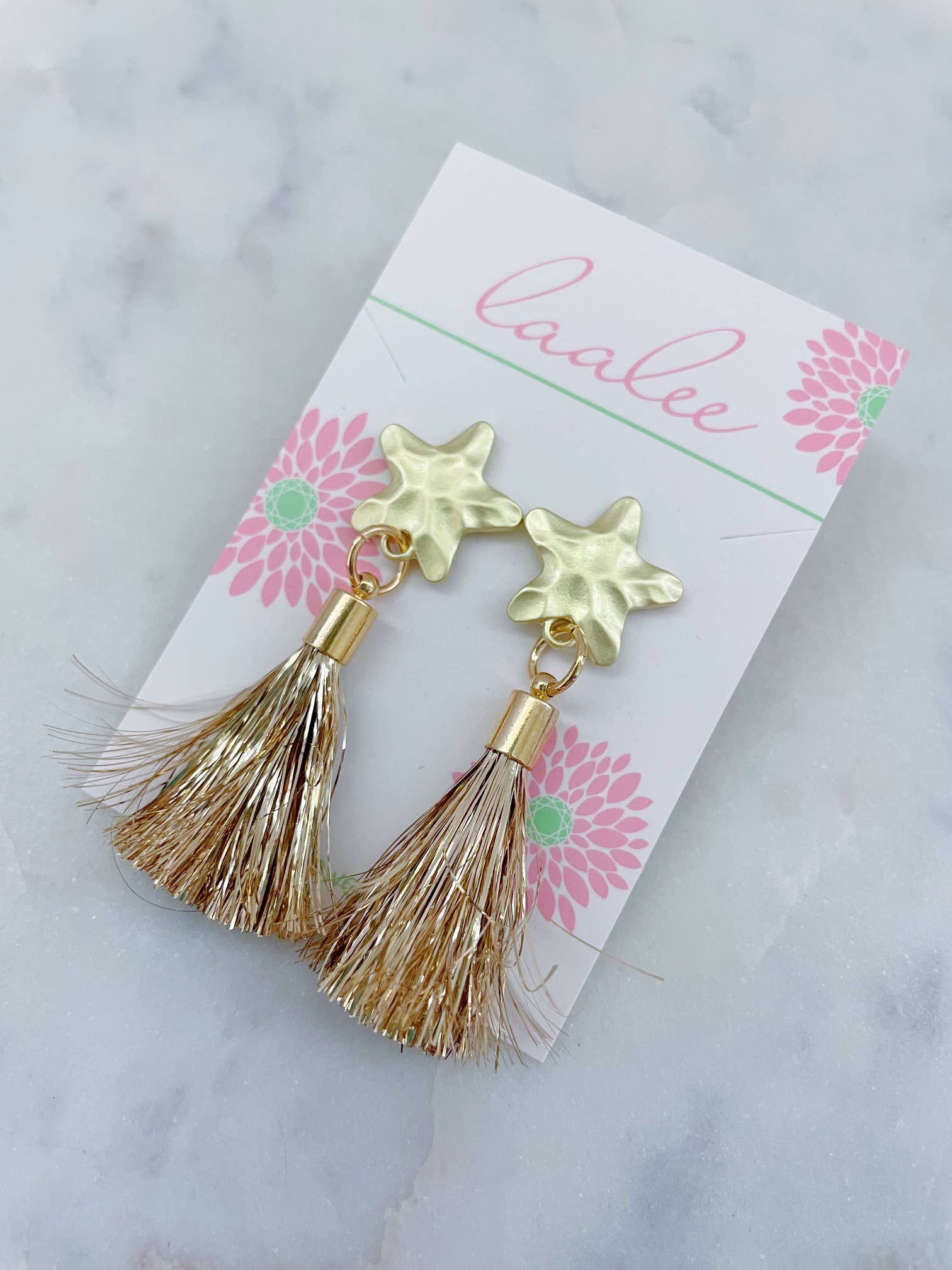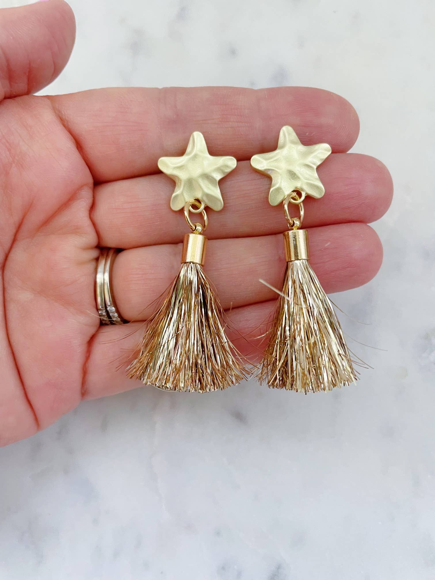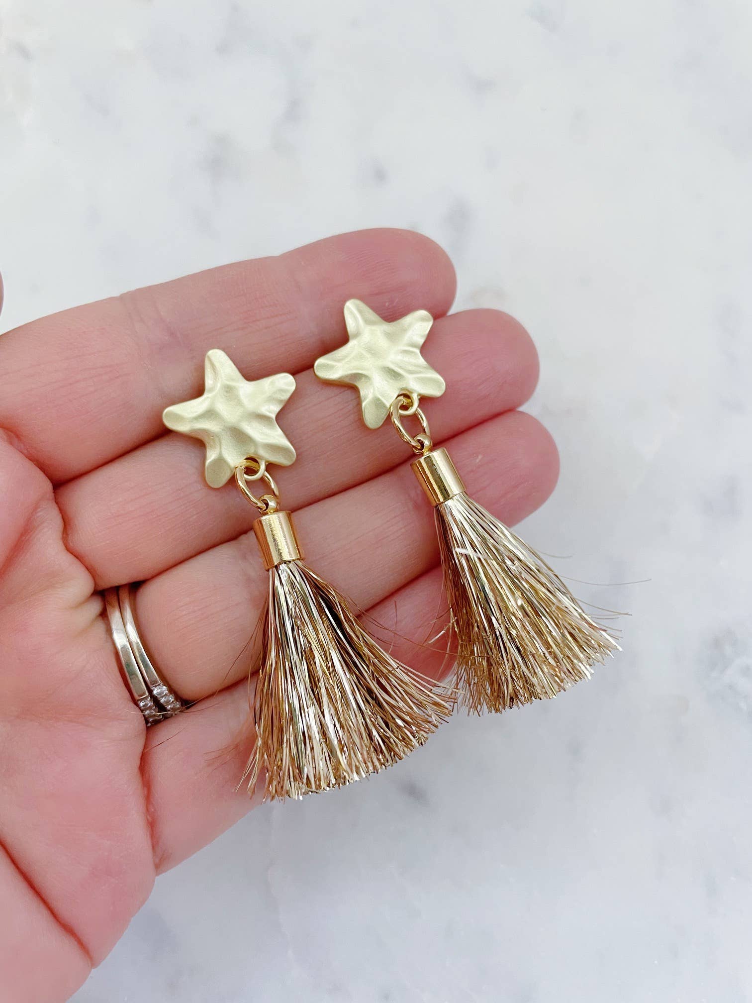 Beautiful star post earrings with a gold tinsel tassel measuring approximately 1.5-2". Perfect as shooting star earrings, 4th of July, Memorial Day, Labor Day, Veterans Day, or any patriotic event!